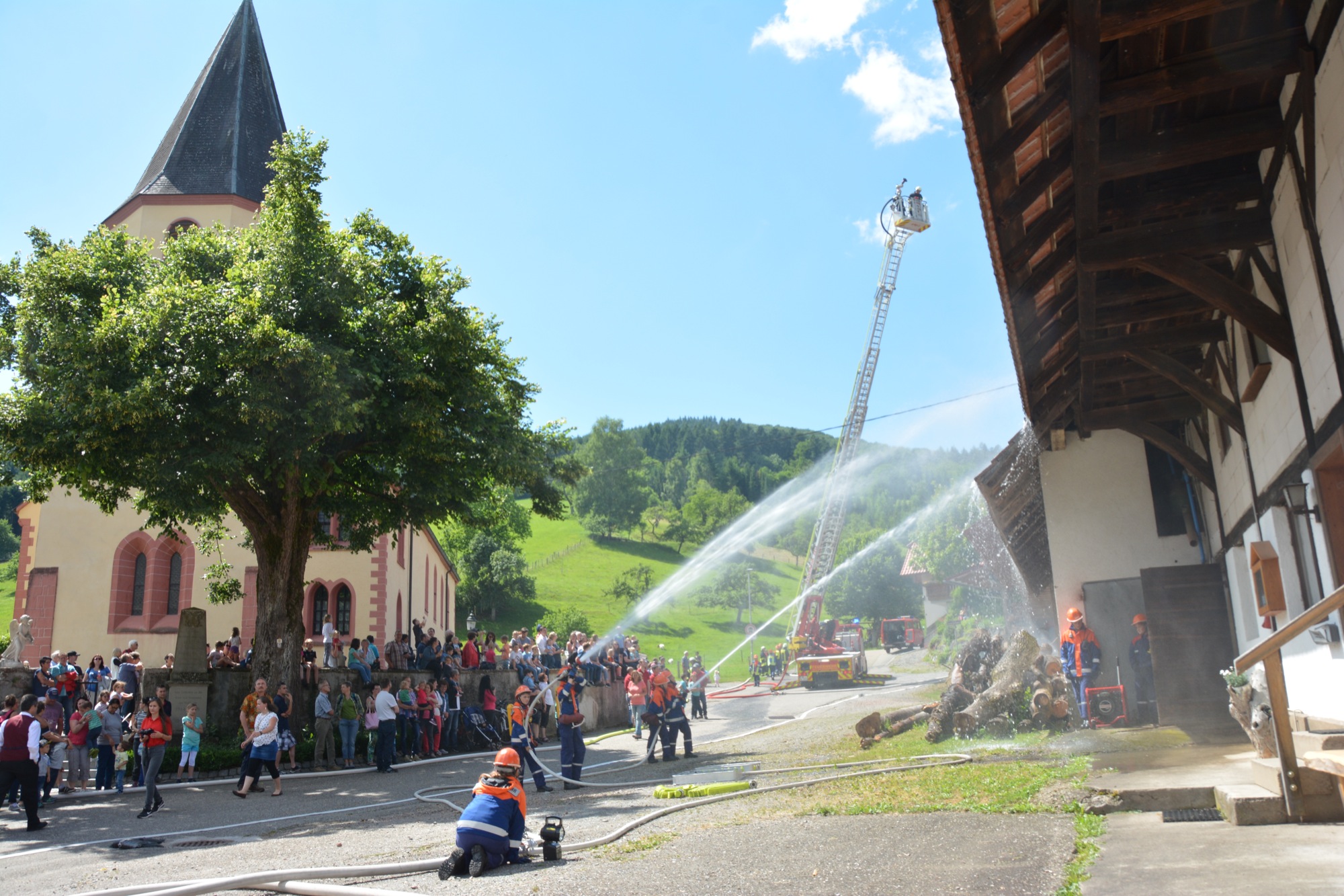Am Ende der anschaulichen Übung gab es großen Applaus von den zahlreichen Zuschauern. Auch Gesamtkommandant Klaus Disch, der zu den interessierten Beobachtern zählte, hat viel Lob für den Feuerwehrnachwuchs parat. Und wie bei den Großen waren die Jugendfeuerwehrkameraden dann als Dank für ihren Einsatz von ihren Prinzbacher Kameraden zu einem gemeinsamen Essen ins Festzelt eingeladen. Dort nahmen am späten Nachmittag die »Geroldsecker Musikanten« auf der Bühne Platz und sorgten für einen unterhaltsamen Ausklang des Pfingstsonntags und des gelungenen Feuerwehr-Doppeljubiläums.