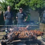 Auch die Prinzbacher Dorfgemeinschaft half mit, den Besucheransturm zu bewältigen und um alle Gäste mit Speisen und Getränken zu versorgen. Für Ortsvorsteher Klaus Beck und Friedrich Roser beispielweise war die Nacht schon morgens um vier Uhr zu Ende. Sie feuerten das Buchholz an, über dem mehrere Stunden lang vier Spanferkel gegrillt wurden. Dies ist eine beliebte Spezialität bei den Highland-Games, die schon am frühen Nachmittag ausverkauft war. Den ganzen Tag über waren die Mitglieder der Feuerwehr im Einsatz um den Autoverkehr zu regeln. Eine Stau Richtung Prinzbach gibt es nur einmal im Jahr.