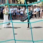 Sowohl die Braut als auch der Bräutigam durften anschließend versuchen das runde Leder ins Tor zu schießen. DJK-Vorstand Markus Schäfer überbrachte dem Brautpaar die Glückwünsche und Geschenke des Vereins.
