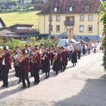 Nach der Eucharistiefeier machte man sich bei strahlendem Sonnschein auf zur Prozession durch den Ort. Angeführt von Kreuz und Fahnen, dem Musikverein, dem Kirchenchor, den Kommunionkinder sowie den Ministranten folgte der Himmel mit der Monstranz und dem Allerheiligsten, getragen von Pater Christoph. Ihm folgten die restlichen Gläubigen durch das Dörfle und die Bergwerksstraße zurück zur Kirche.