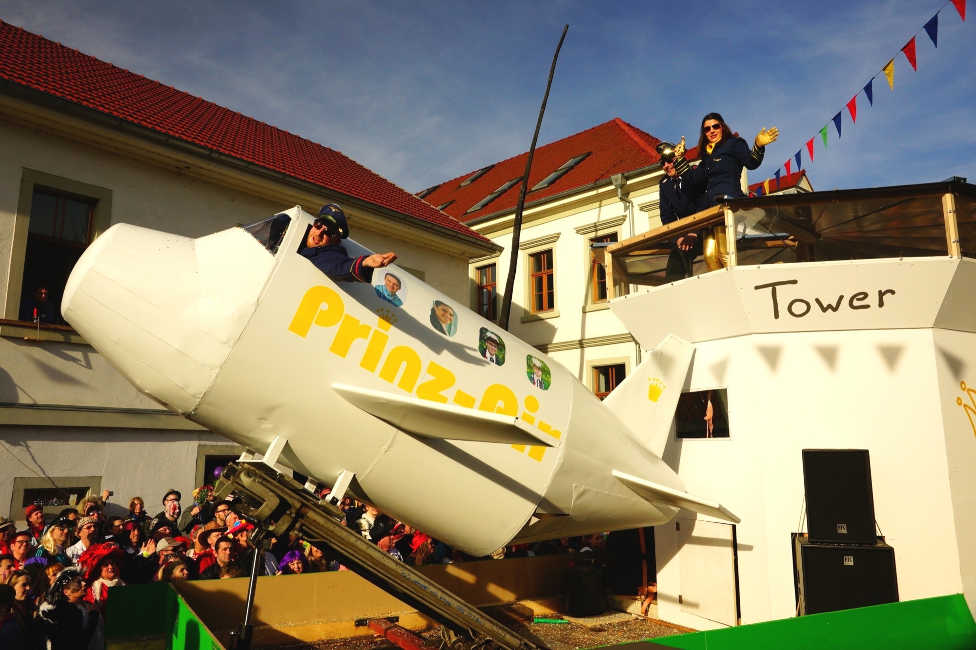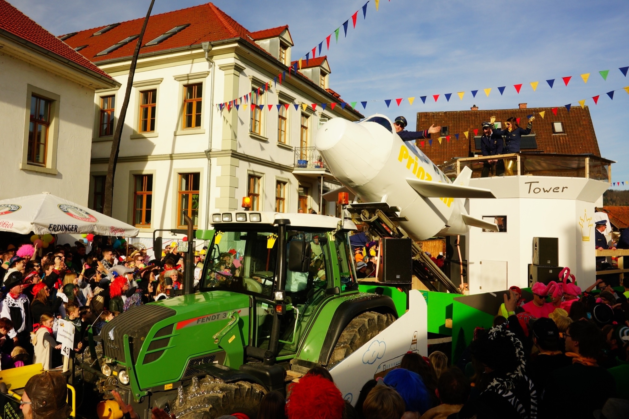 Eine neue Fluggesellschaft lehrt dem »Kranich« das Fürchten: »Mit Prinzbach Air fliegen bis auf Wolke sieben« ist ihr Motto. International wurde es bei der »URP«. Sie hatten Queen Elisabeth mit ihrer Leibgarde zu Gast. Donald Trump ließ es sich auch nicht nehmen, Biberach kommunalpolitische Vorgaben zu machen. »Make Biberach great again«, tönte er und schlug vor, eine Mauer zwischen Biberach und Prinzbach zu bauen.“