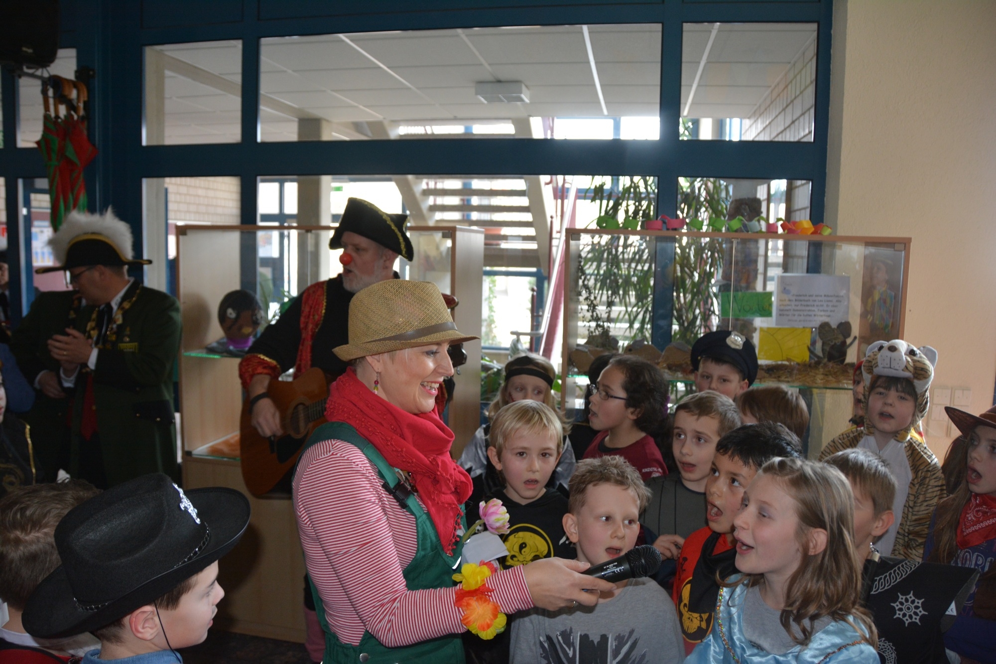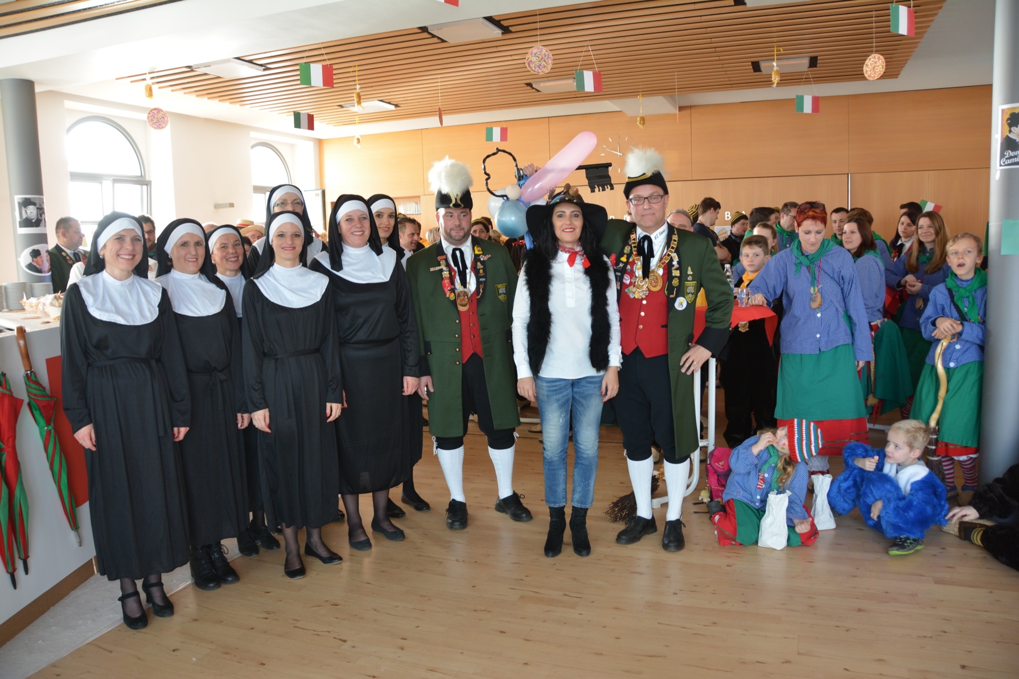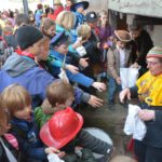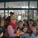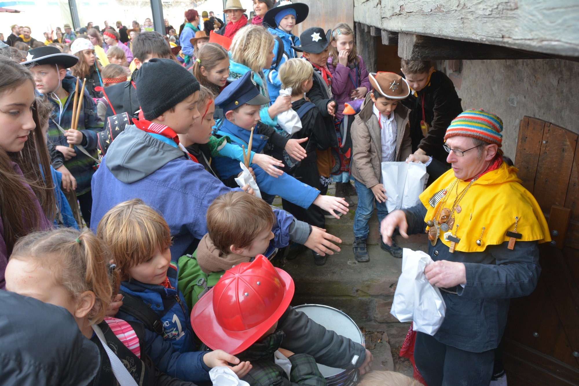 Die Polonaise zog erst durch die Pausenhalle und dann weiter zum Narrenkeller, wo jedes Kind eine ganze Tüte mit Narrenfraß bekam, spendiert von der Narrenzunft Biberach. Wienerle und Brezel, ein gesunder Apfel und jede Menge Süßigkeiten sollen den Nachwuchs für die närrischen Tage stärken.