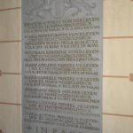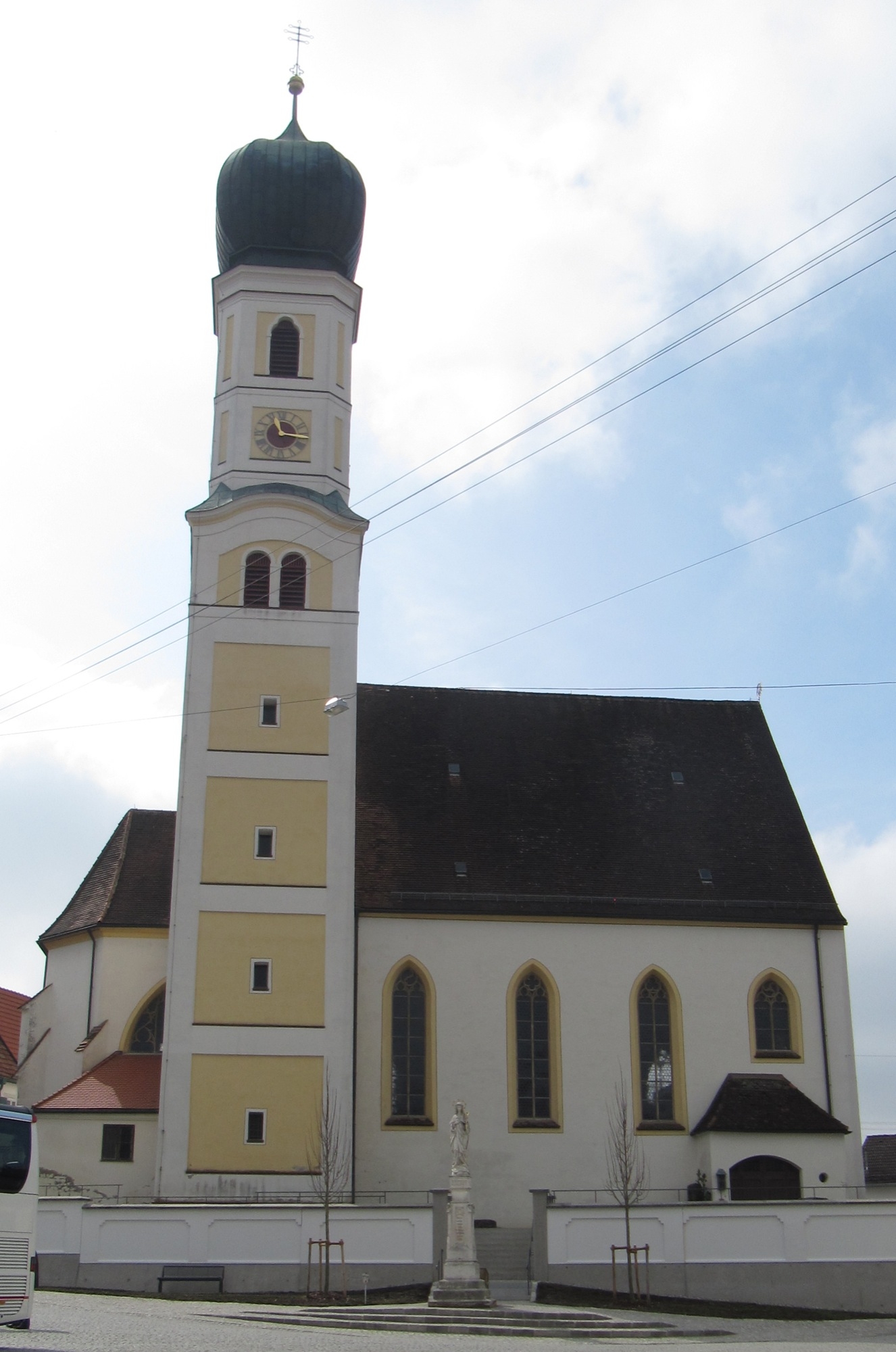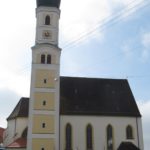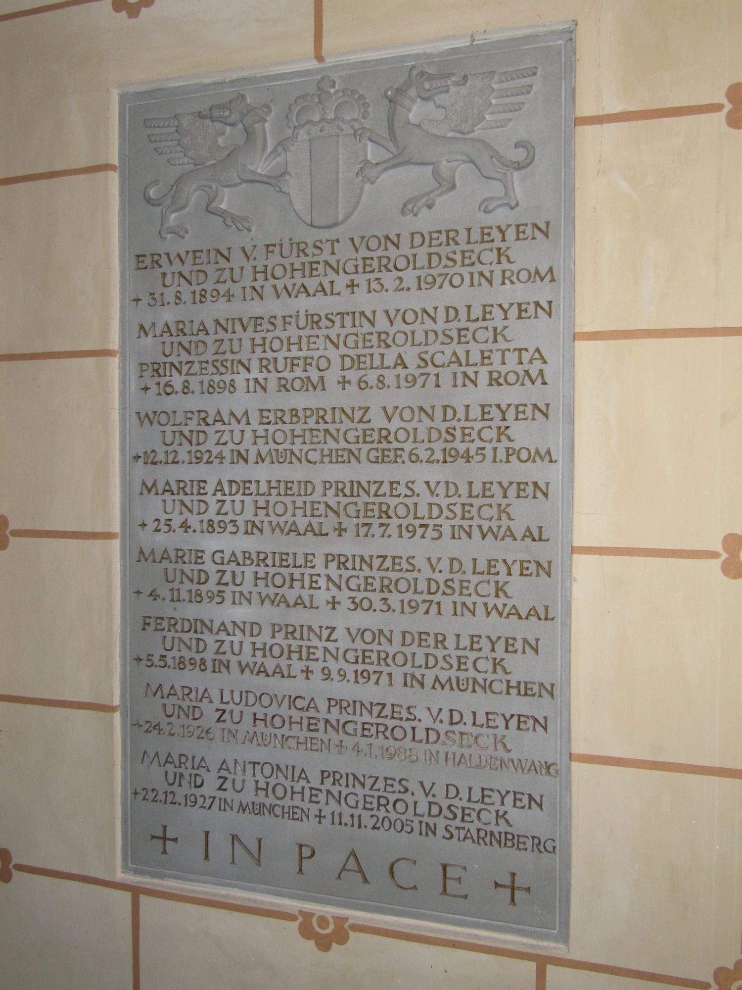 Nach dem Mittagsmahl führte Adalbert Hindinger, ortskundiger Dorfbewohner, die Besucher in die ehemalige Schlosskapelle und heutige kath. Pfarrkirche. In ihr hat die Familie von der Leyen in den Stifter-Wappen ihre Spuren hinterlassen; in der Gruft befindet sich ihre Grablege. Diese ist jedoch für Besucher unzugänglich.