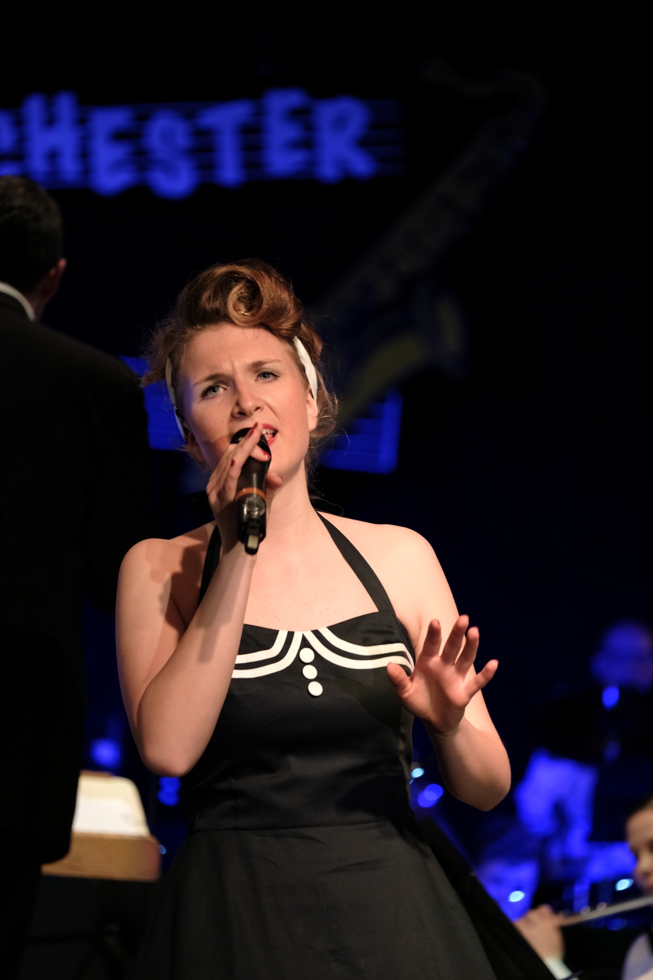 Zum Ende ging es zurück in die wilden 50er Jahre. Leonie Müller sang im Petticoat-Kleid Evergreens von Connie Francis. »Schöner fremder Mann«, »Die Liebe ist ein seltsames Spiel« und andere mehr. Es folgt ein 50er Jahre Medley des Orchesters.