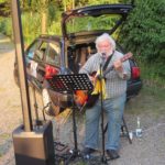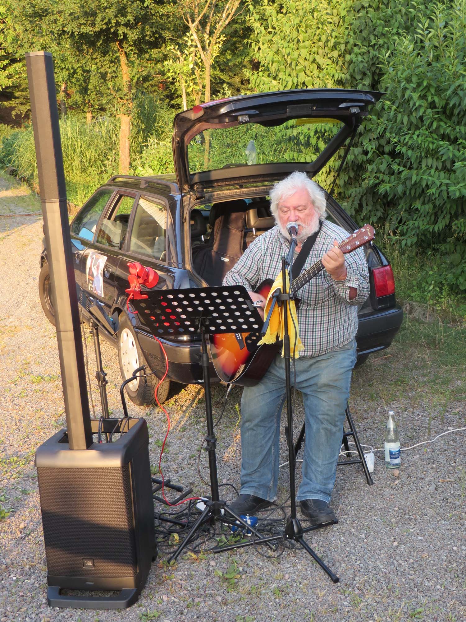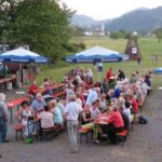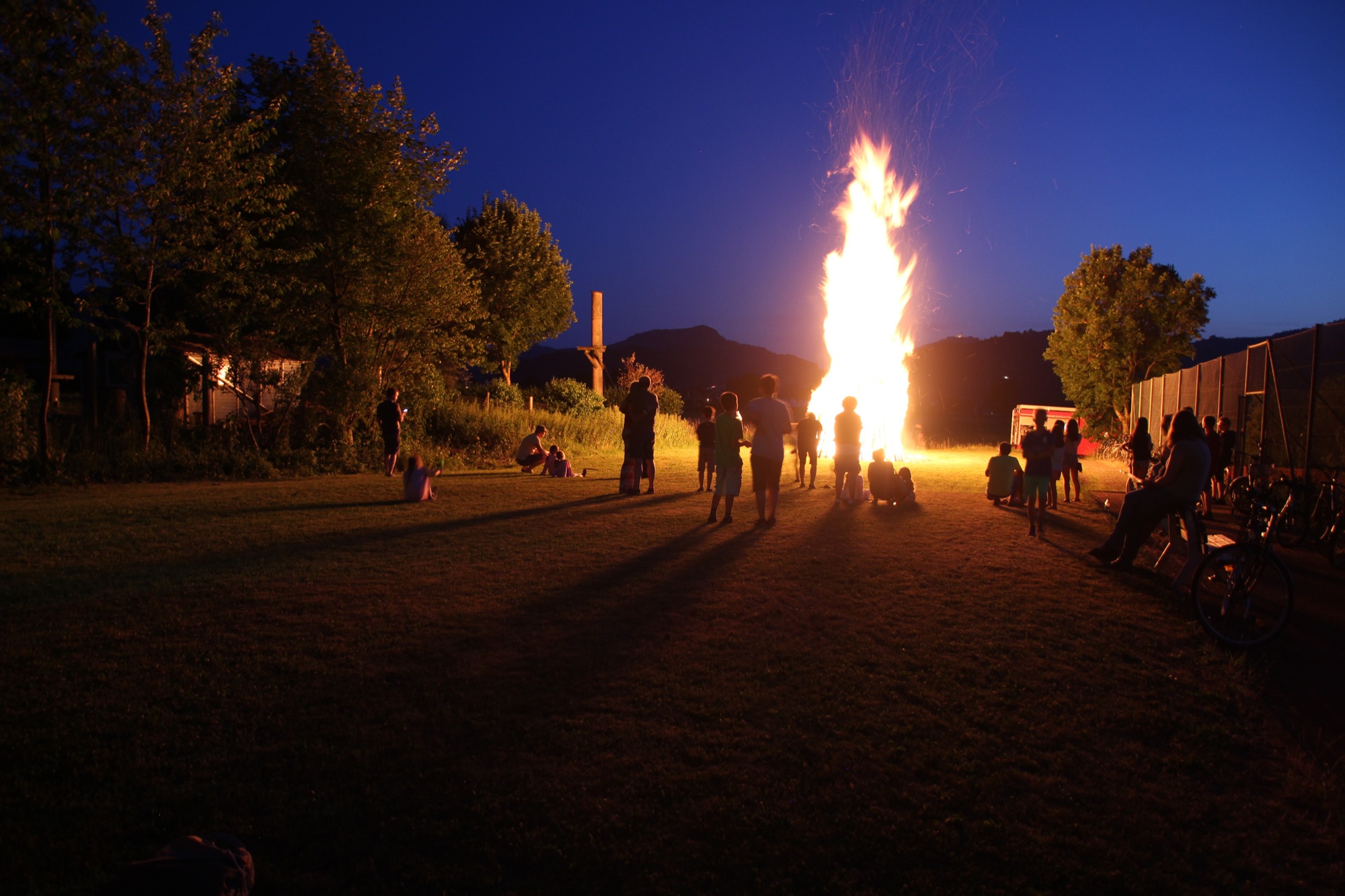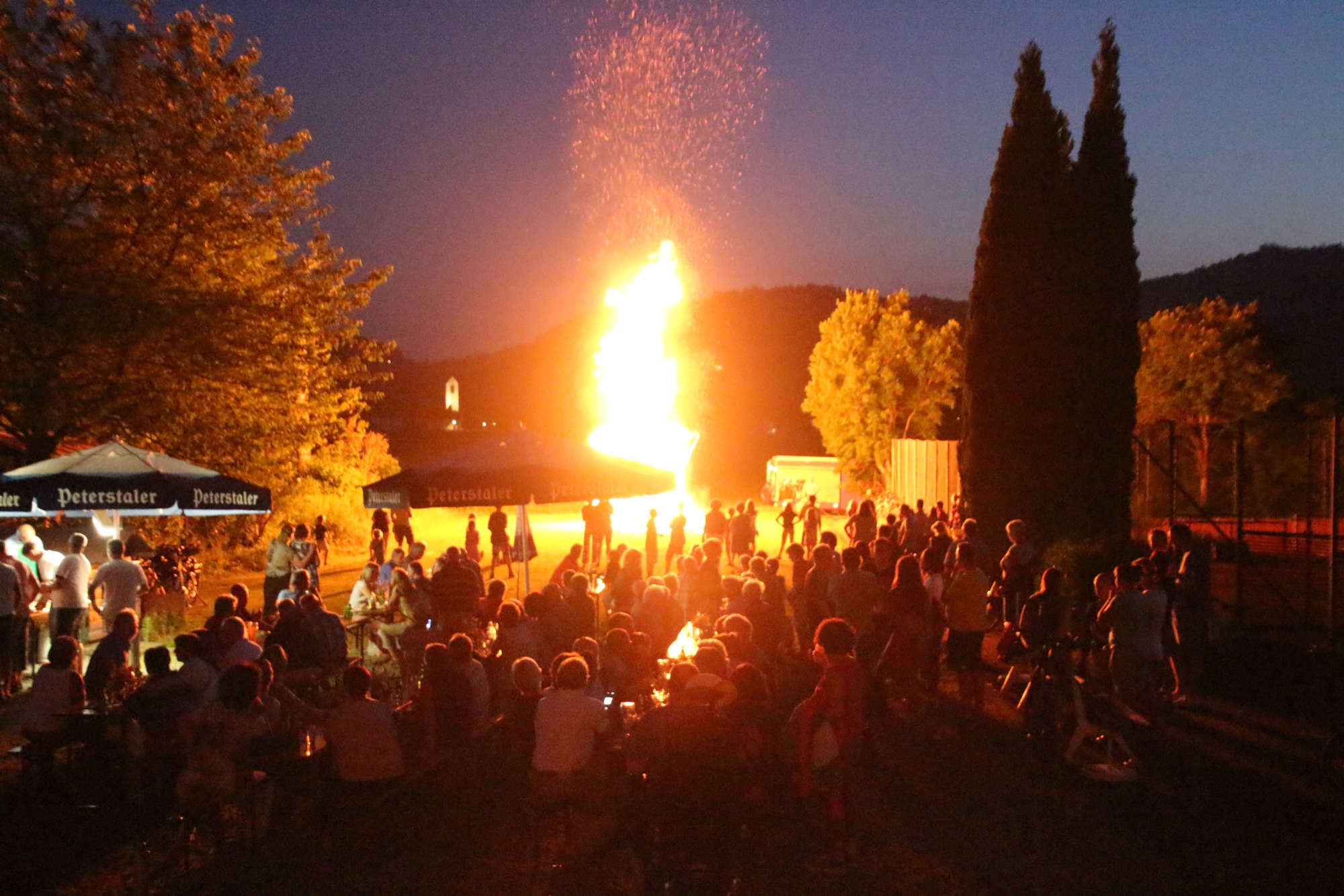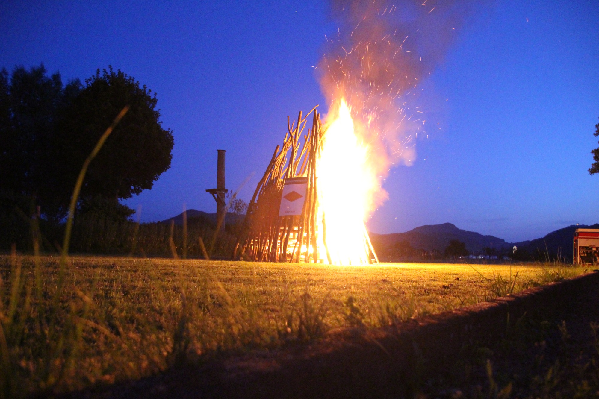 Am Abend wurden die Gäste mit Grillwürsten und kühlen Getränken bewirtet. Mit viel Applaus für die Live-Musik wurde der Alleinunterhalter Jochen Singler von den etwa 150 Besuchern bedacht. Gegen 22.15 Uhr war es dann soweit, das Johannisfeuer wurde von Hans Gißler, Hans Höhn und Hans Cunico von der Feuerwehr Biberach entfacht. Diese standen auch mit dem Löschfahrzeug bereit, um bei einem Ausweiten des Feuers sofort eingreifen zu können. Kurze Zeit später stand die ganze Pyramide in Flammen. Mit Ahs, Ohs und viel Beifall der Zuschauer schlugen die Flammen hoch in den sternenklaren Nachthimmel.