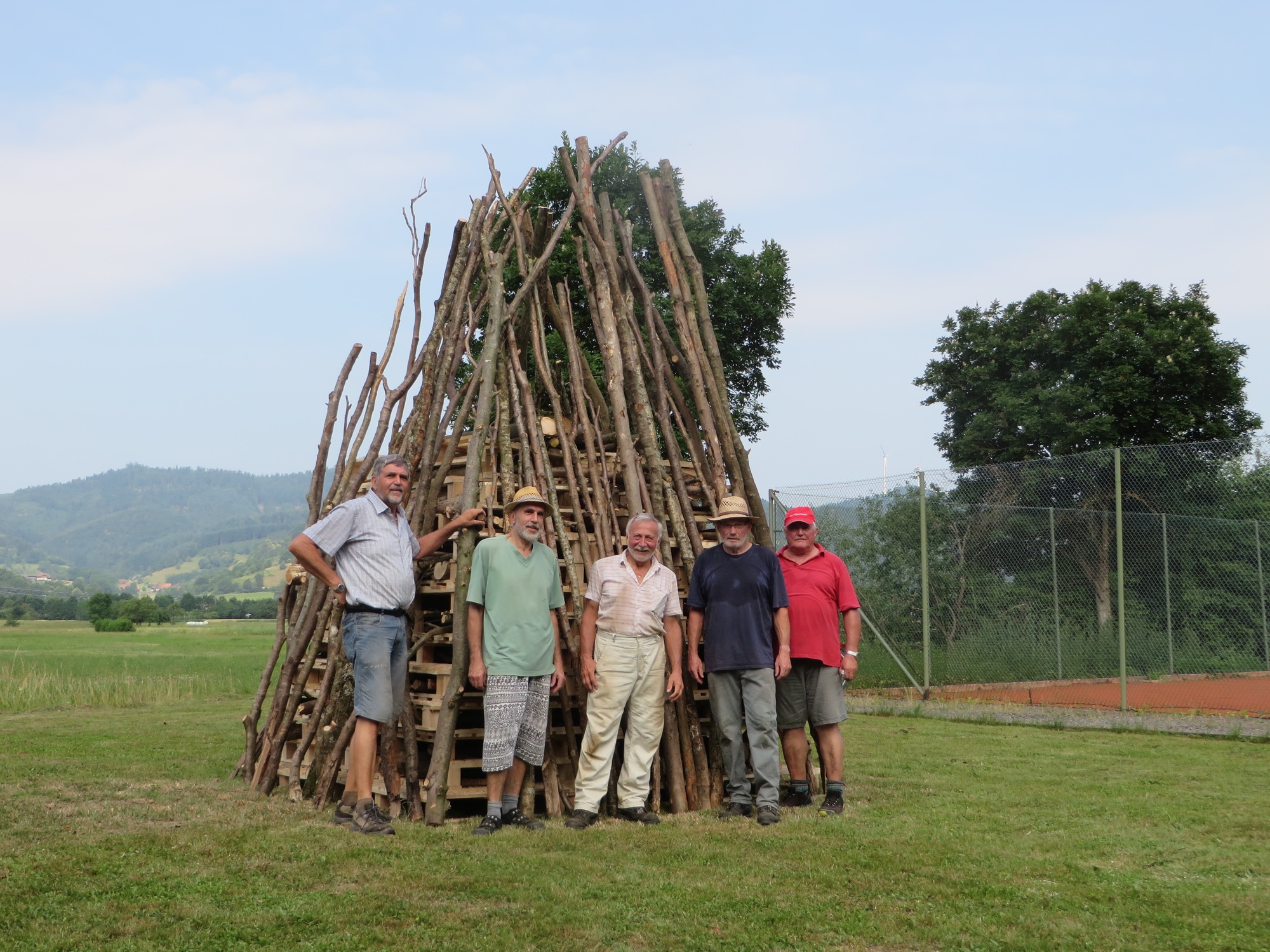 Bestückt wurden die Zwischenräume der Holzpaletten mit Buchen- und Eichenrollen, um den Paletten den nötigen Halt zu geben. Zum Abschluss der Arbeiten wurde die ganze Konstruktion rundum mit vier Meter langen Holzstangen verkleidet. Nach zweistündiger Arbeit war die Johannispyramide fertig.