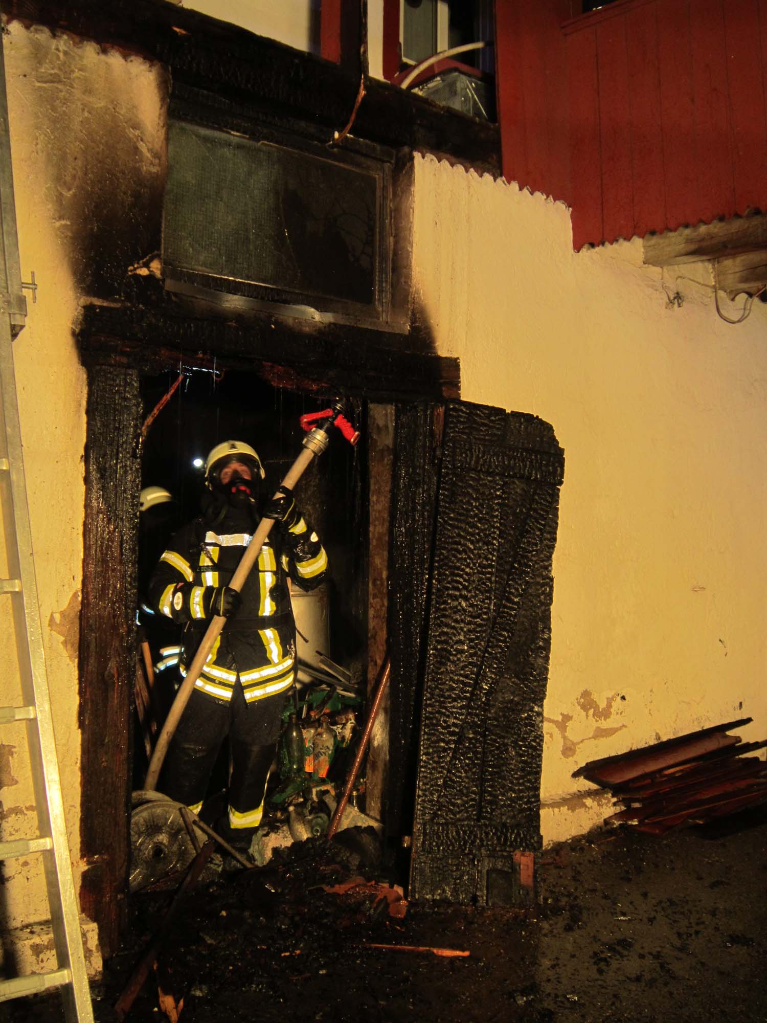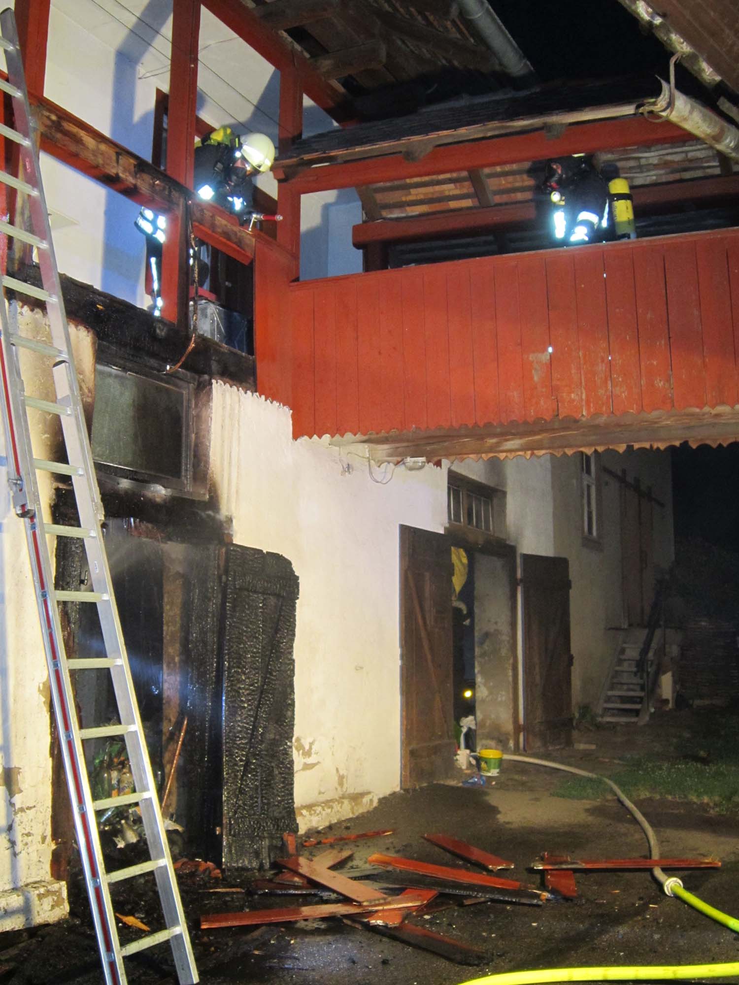 An einem ehemaligen landwirtschaftlichen Anwesen schlugen beim Eintreffen der Hilfskräfte die Flammen bereits aus der durchgebrannten Außentür. Die Hausbewohnerin, die in der darüber liegenden Wohnung geschlafen hatte, bemerkte glücklicherweise den Brand im Erdgeschoss und konnte das Gebäude unverletzt verlassen.