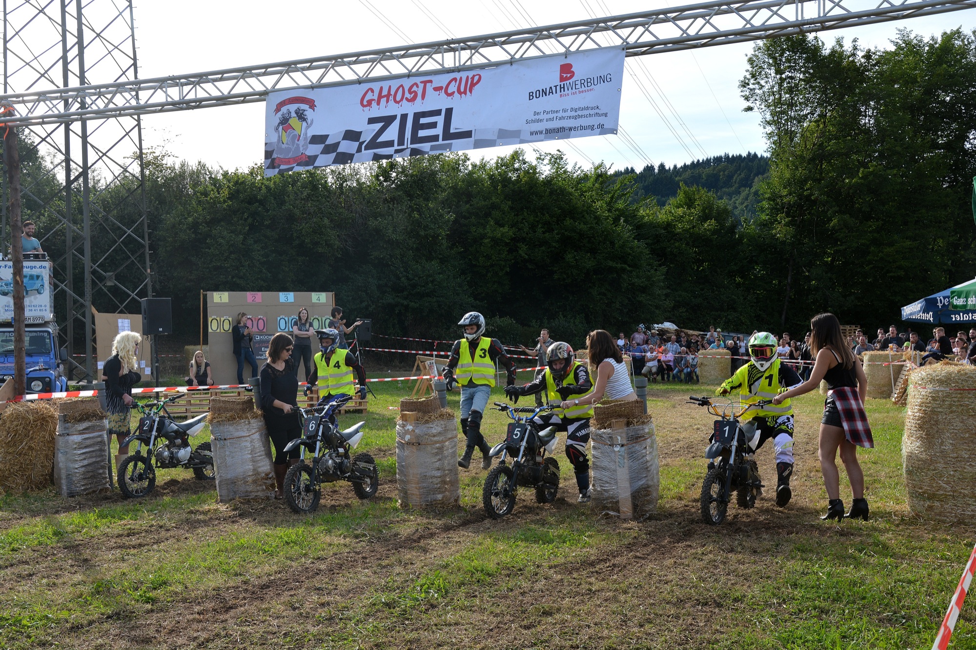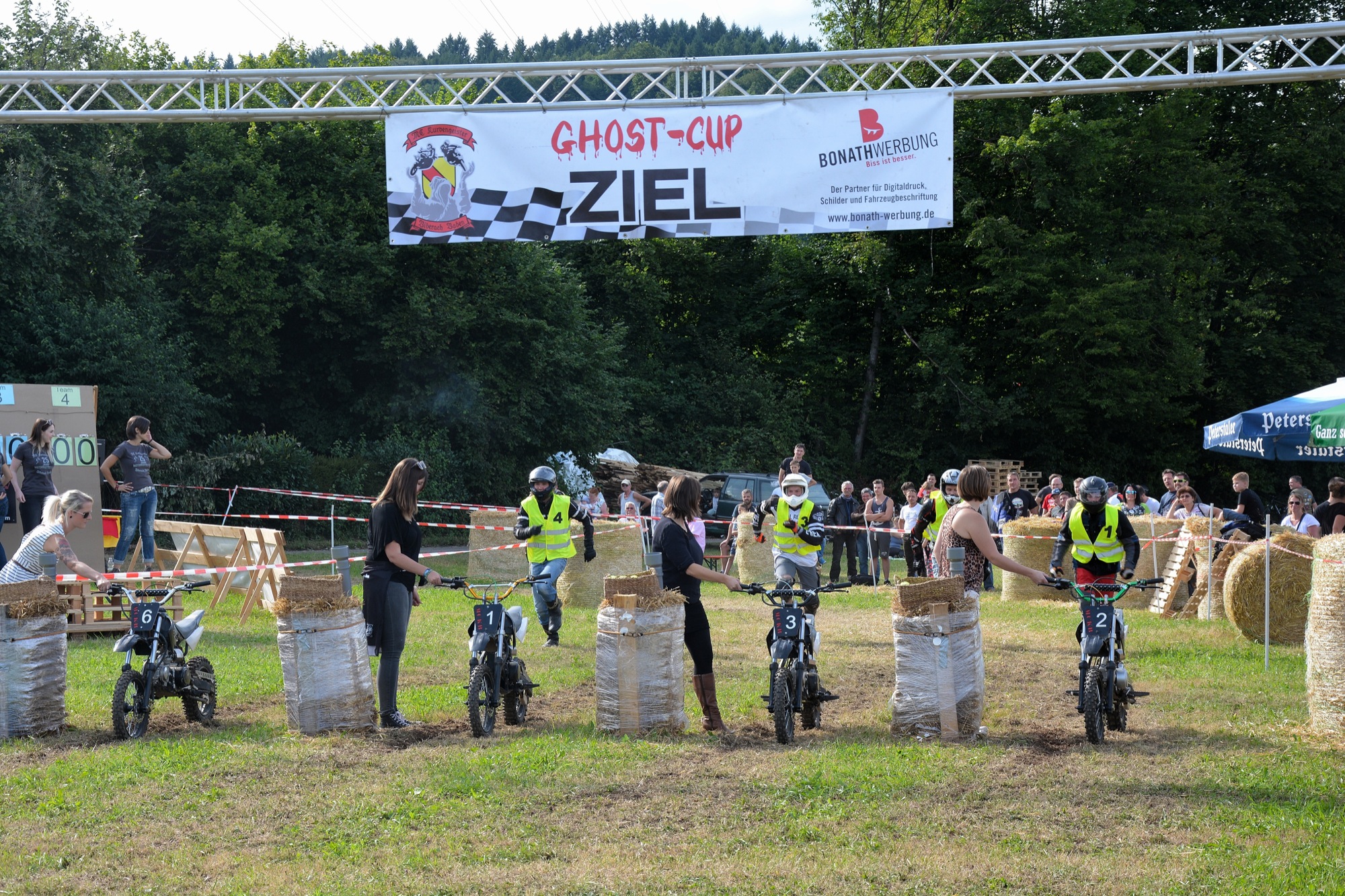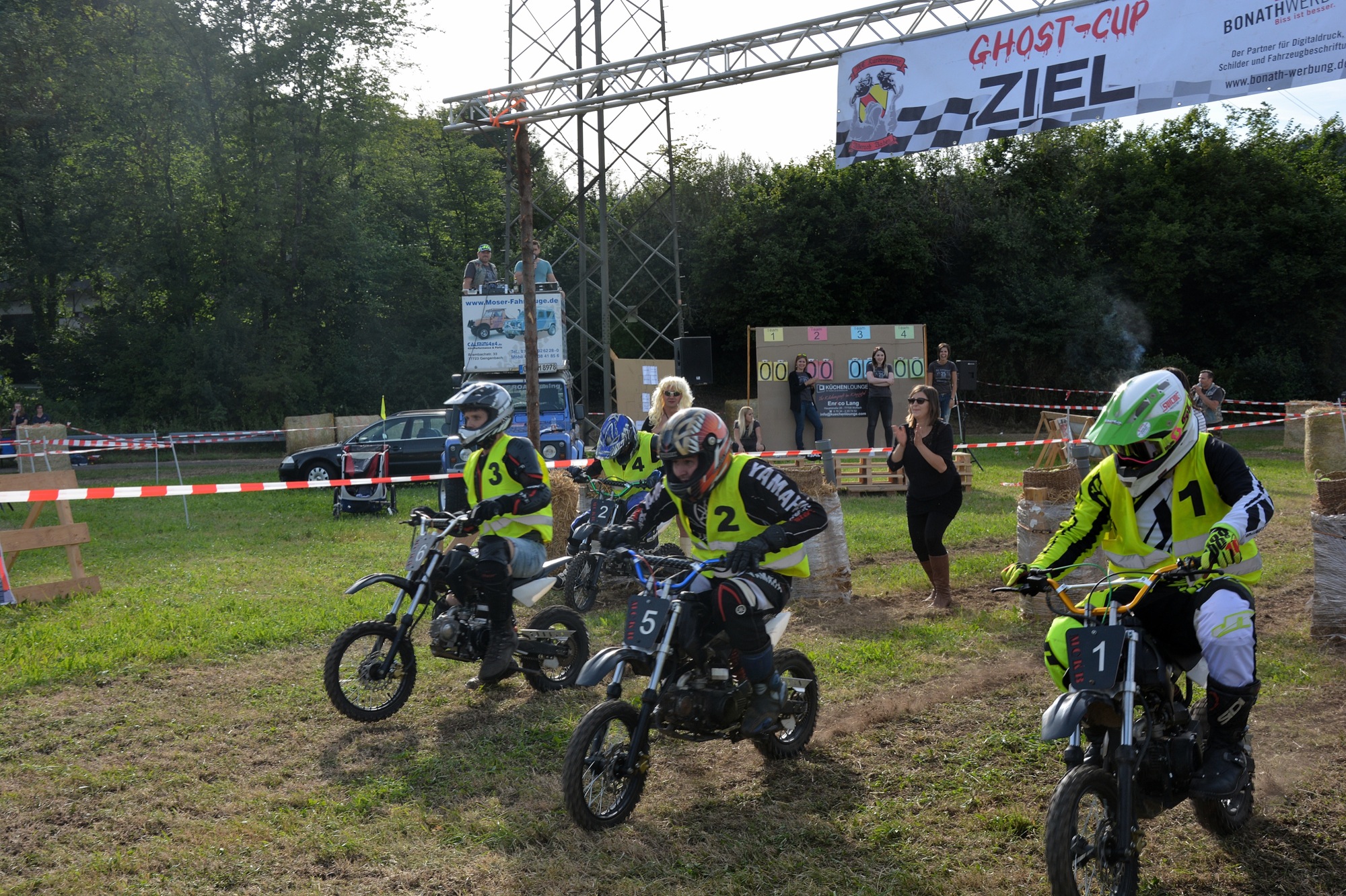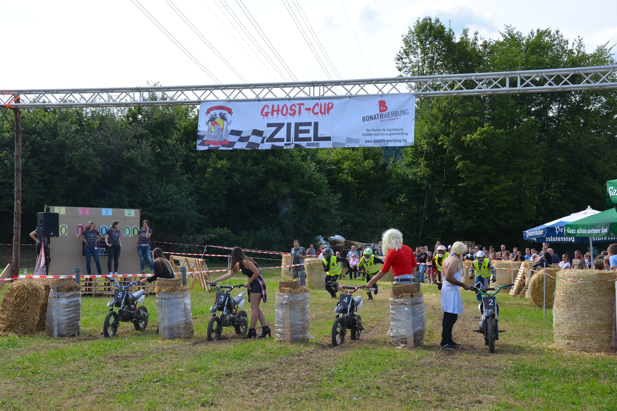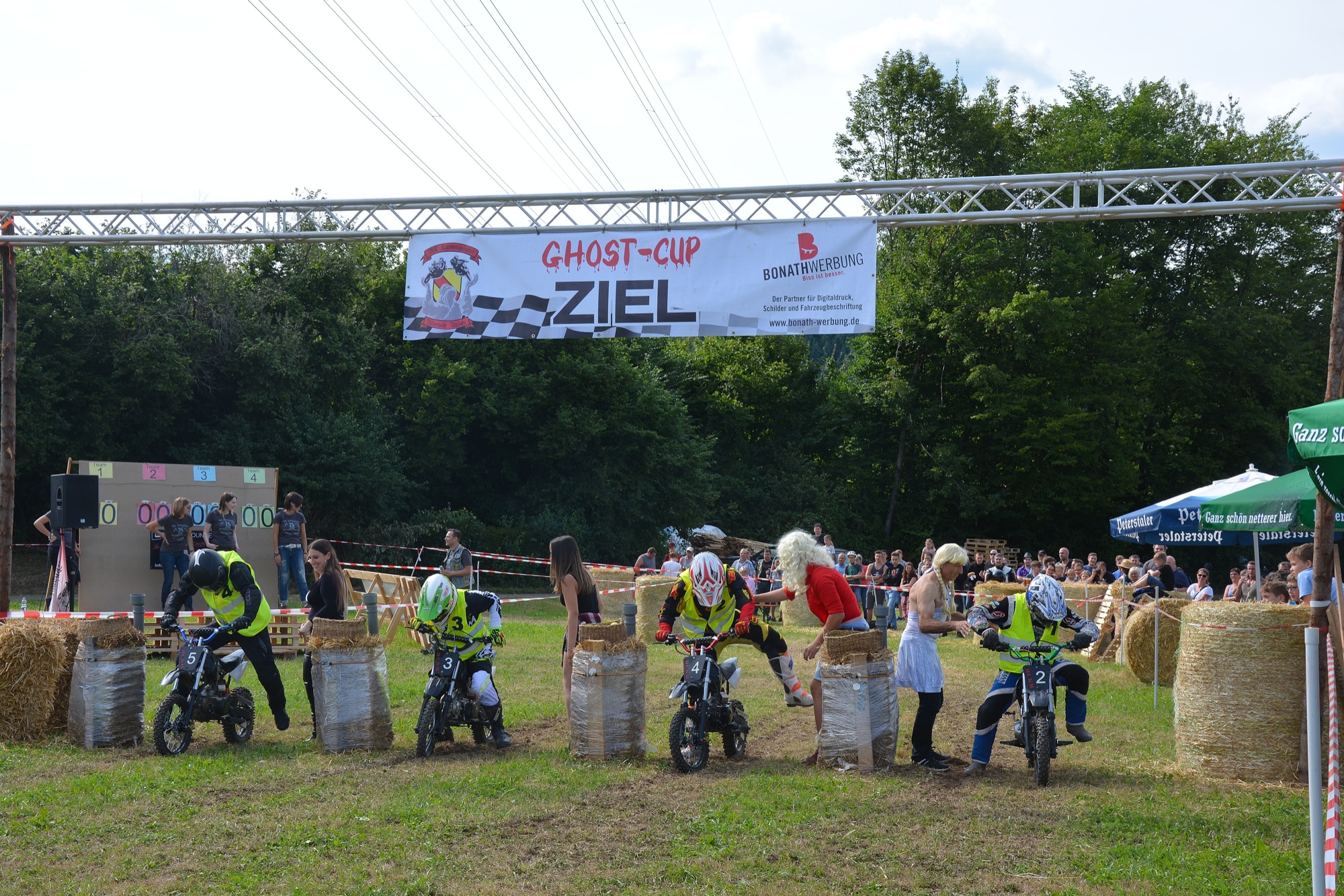 Los gingen die Rennen im bewährten Le-Mans-Start. Nach dem Startschuss mussten die Fahrer eine Distanz von zehn Metern zu ihren laufenden Pocket-Bikes rennen. Diese wurden von den Boxenludern gehalten, damit der Fahrer nur noch aufsteigen musste. In der ersten Kurve kam es dann schon öfter zu kleineren Reibereien, um schnellstmöglich an die Spitze zu gelangen. Auch die letzte Steilkurve sorgte für Spannung. Immer mal wieder kam es zu Stürzen, die zum Glück harmlos waren, oder der Motor des Bikes wurde abgewürgt. Die Fahrer waren jedoch alle durch die vorgeschriebene Schutzkleidung gut geschützt. Die Witterungsverhältnisse der letzten Tage hatten dafür gesorgt, dass dieses Jahr kein Matschloch den Circuit zusätzlich erschwerte. Von Rennen zu Rennen lagen die Fahrer enger beieinander und sorgten so für eine immer spannendere Atmosphäre beim »Ghost-Cup«. Im dritten Rennen konnte der zweite Gewinner nicht eindeutig ermittelt werden, da zwei Teams nahezu gleichzeitig ins Ziel einfuhren. Ein Kamerabeweis lag leider nicht vor, also was tun? Kurzerhand mussten die Teams einen Freiwilligen suchen, um bei einem Radler-Wetttrinken den Sieger zu ermitteln.