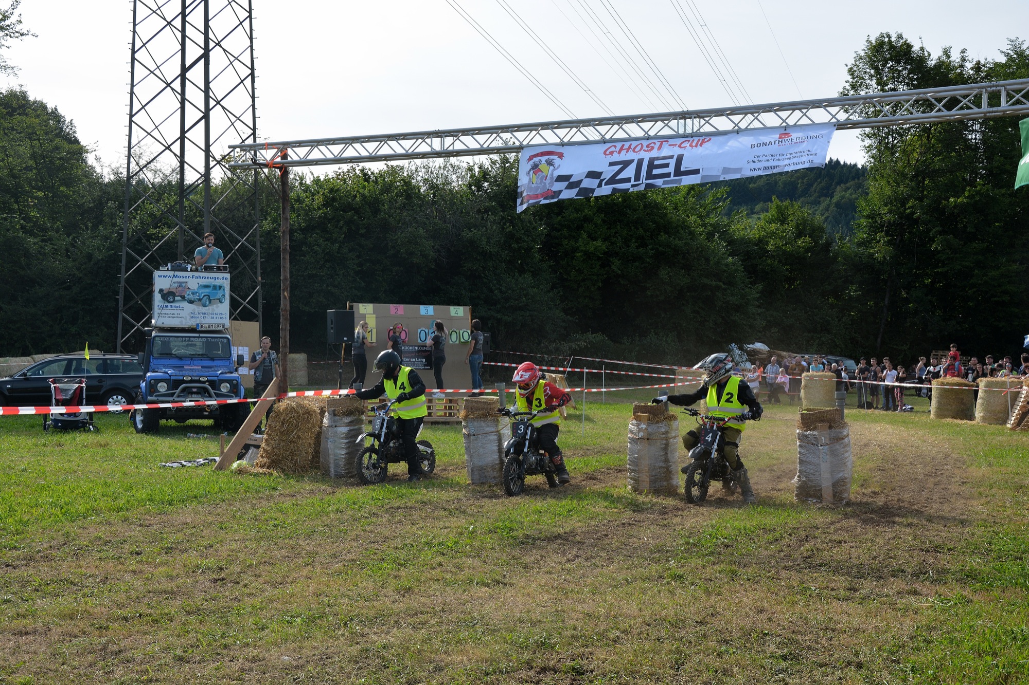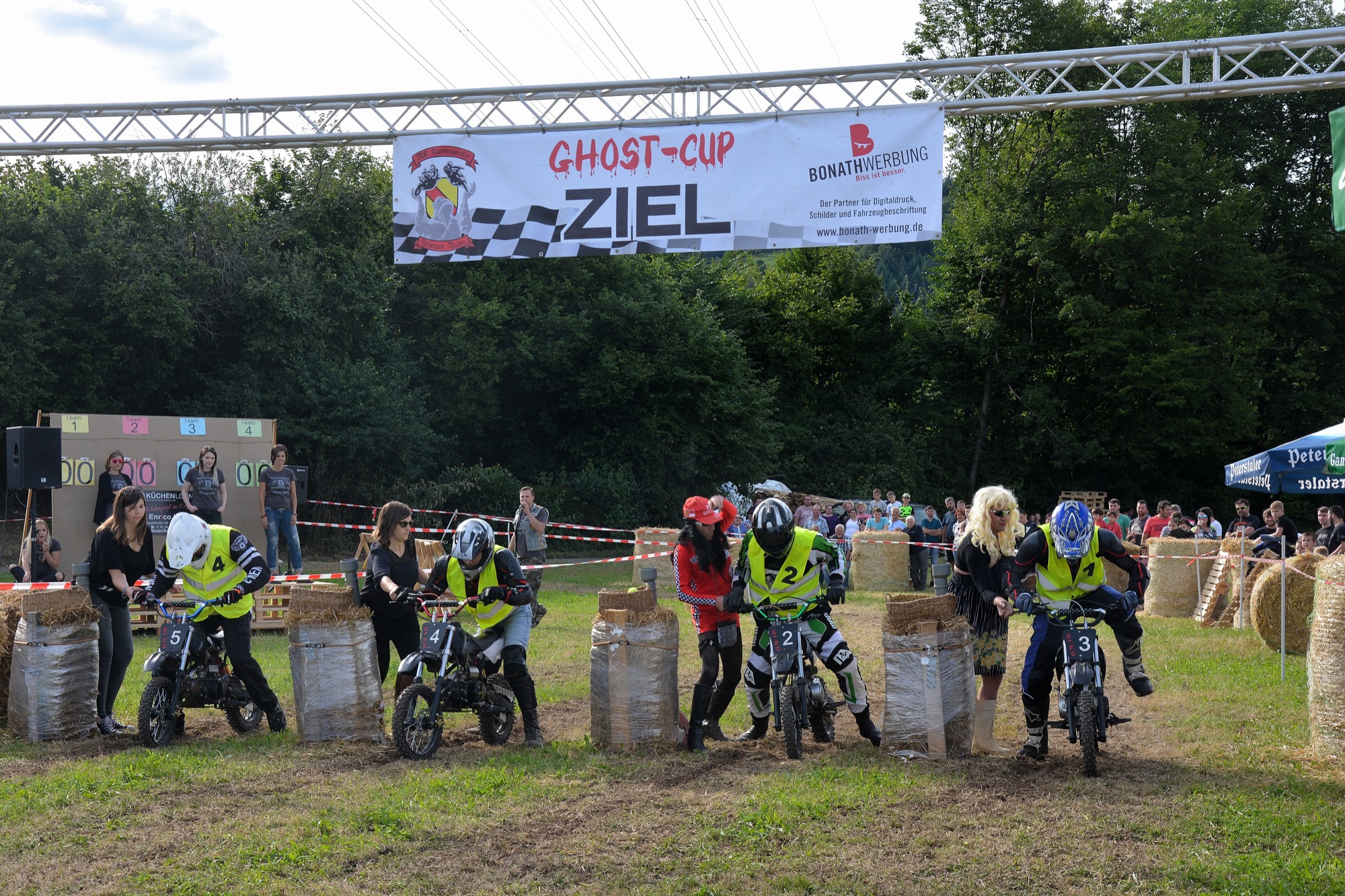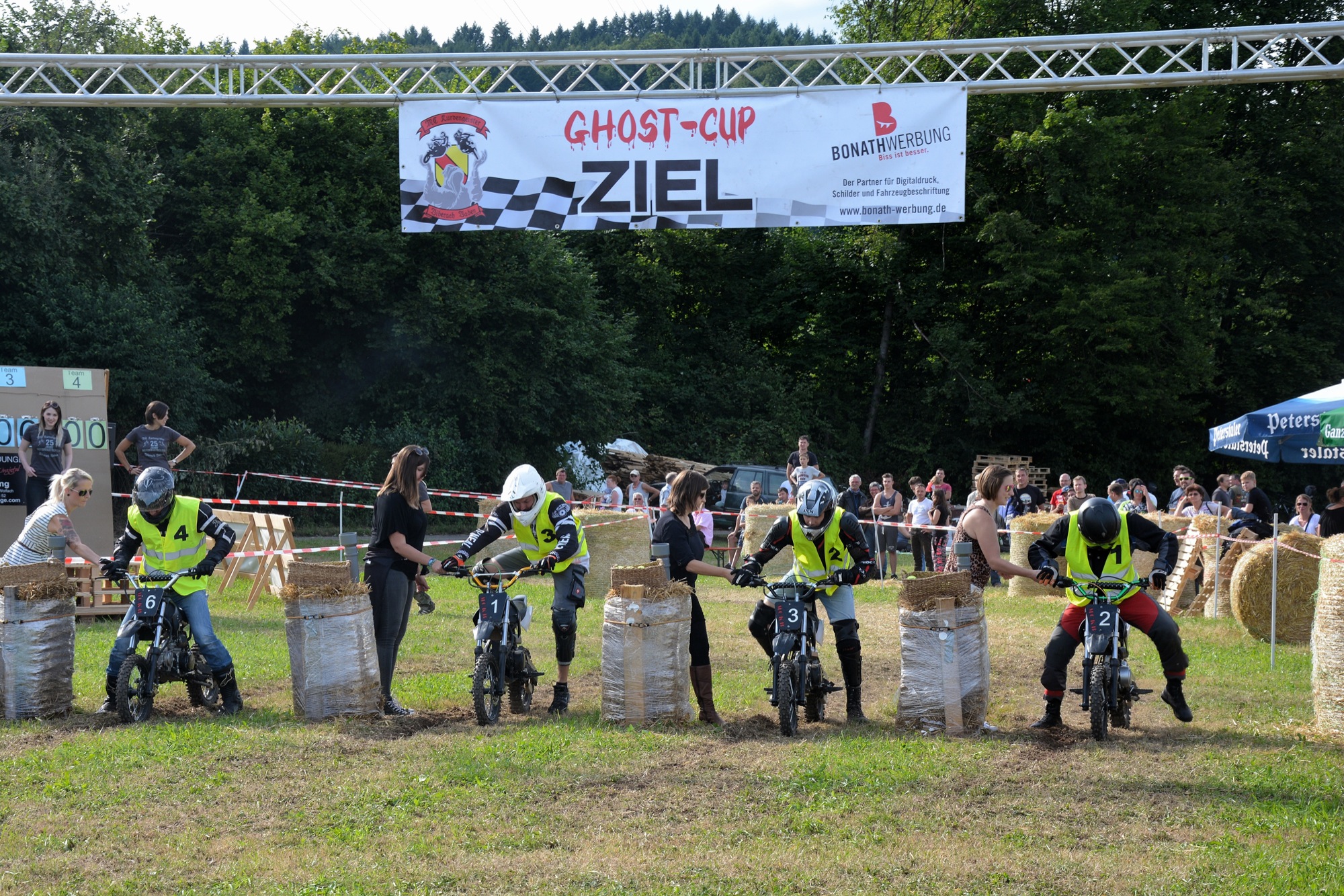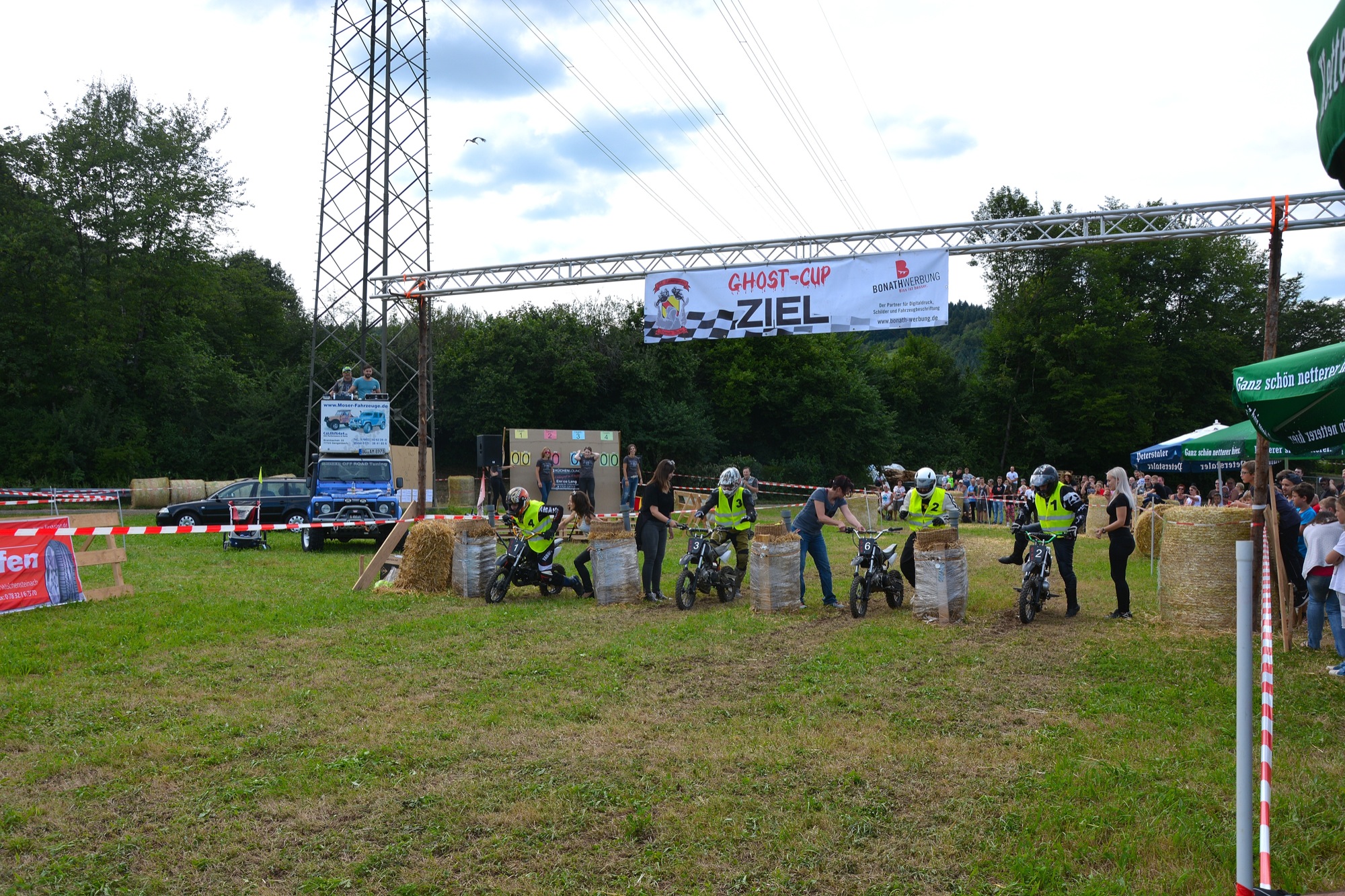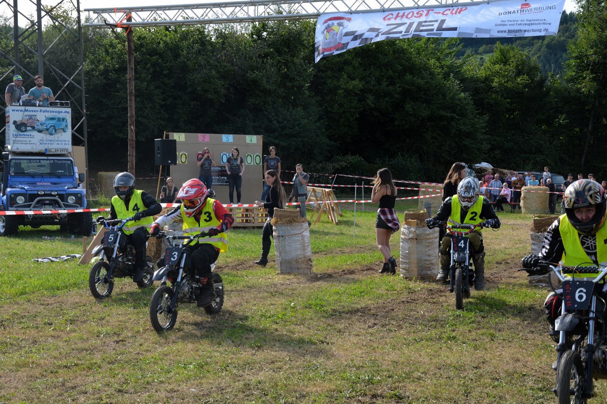 Los gingen die Rennen im bewährten Le-Mans-Start. Nach dem Startschuss mussten die Fahrer eine Distanz von zehn Metern zu ihren laufenden Pocket-Bikes rennen. Diese wurden von den Boxenludern gehalten, damit der Fahrer nur noch aufsteigen musste. In der ersten Kurve kam es dann schon öfter zu kleineren Reibereien, um schnellstmöglich an die Spitze zu gelangen. Auch die letzte Steilkurve sorgte für Spannung. Immer mal wieder kam es zu Stürzen, die zum Glück harmlos waren, oder der Motor des Bikes wurde abgewürgt. Die Fahrer waren jedoch alle durch die vorgeschriebene Schutzkleidung gut geschützt. Die Witterungsverhältnisse der letzten Tage hatten dafür gesorgt, dass dieses Jahr kein Matschloch den Circuit zusätzlich erschwerte. Von Rennen zu Rennen lagen die Fahrer enger beieinander und sorgten so für eine immer spannendere Atmosphäre beim »Ghost-Cup«. Im dritten Rennen konnte der zweite Gewinner nicht eindeutig ermittelt werden, da zwei Teams nahezu gleichzeitig ins Ziel einfuhren. Ein Kamerabeweis lag leider nicht vor, also was tun? Kurzerhand mussten die Teams einen Freiwilligen suchen, um bei einem Radler-Wetttrinken den Sieger zu ermitteln.