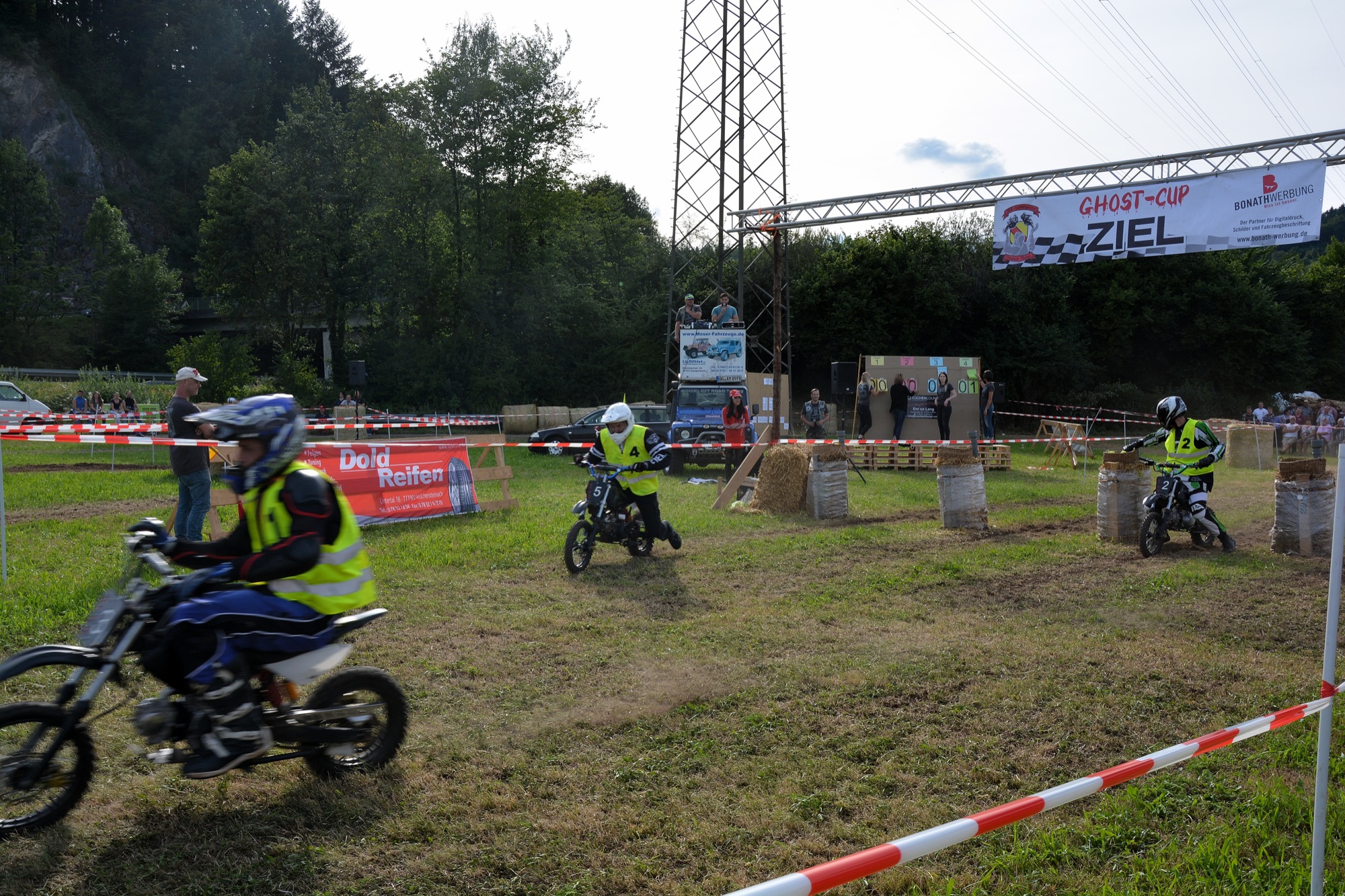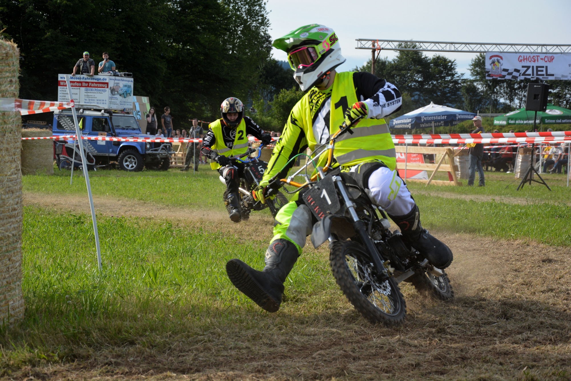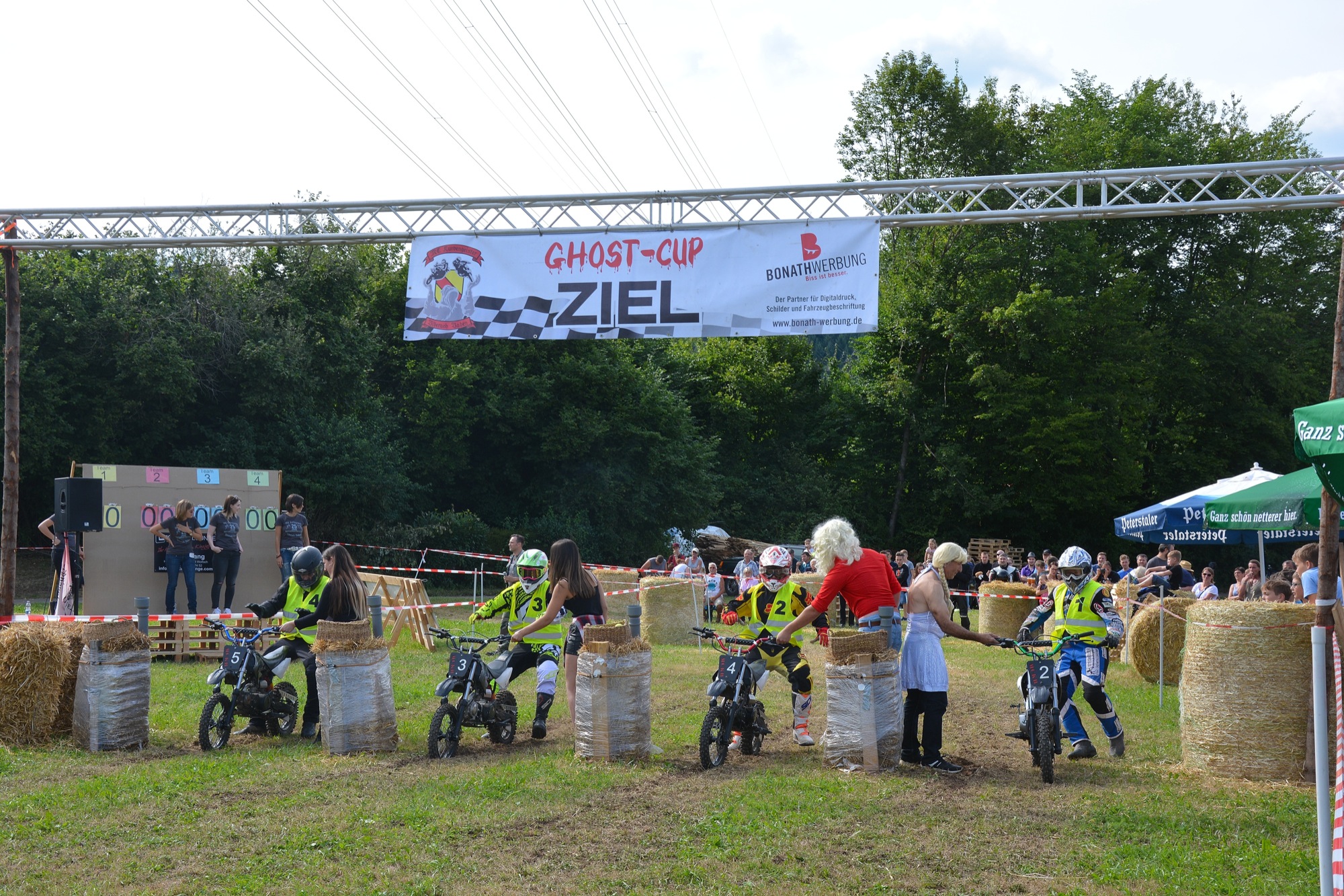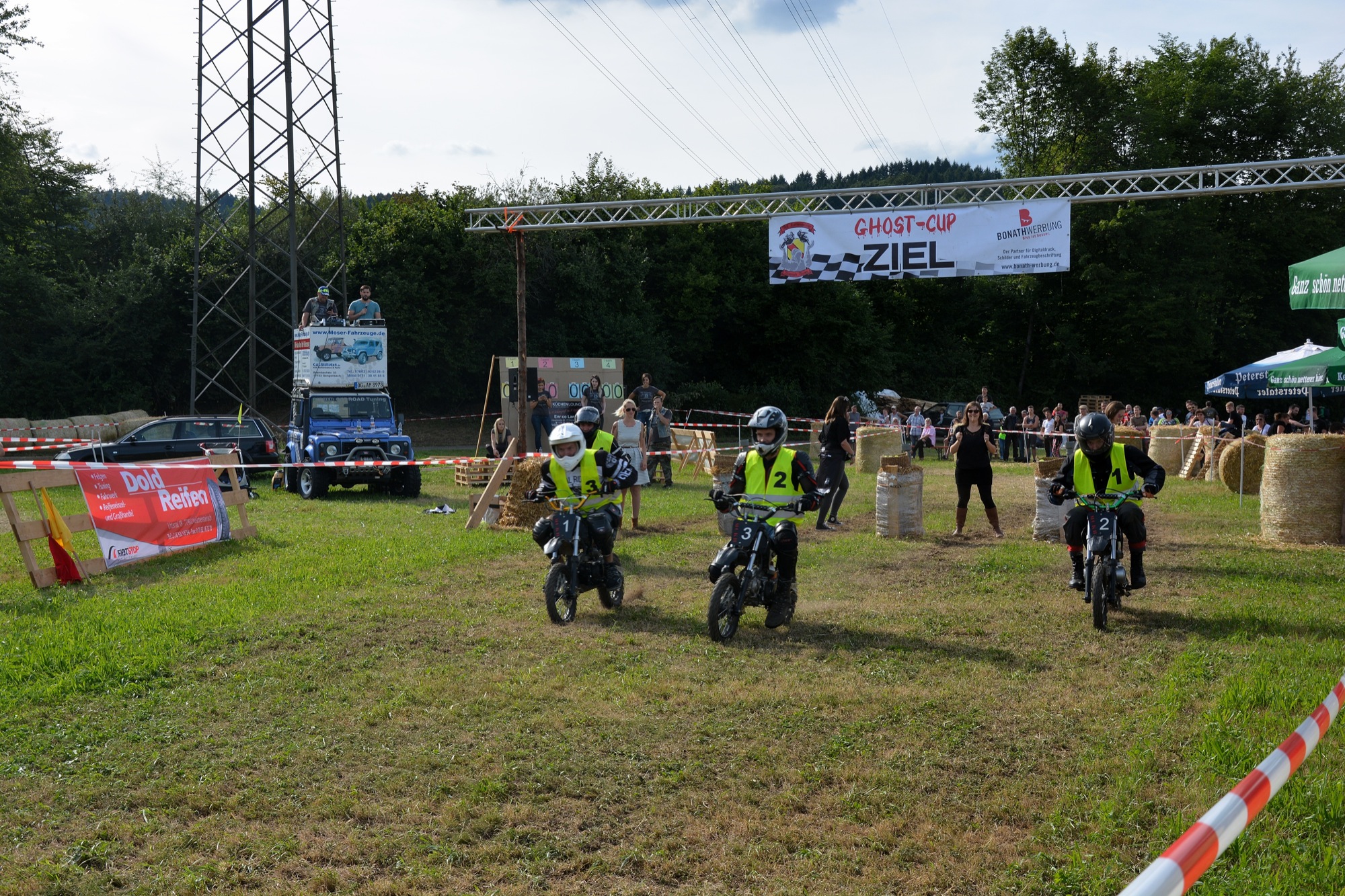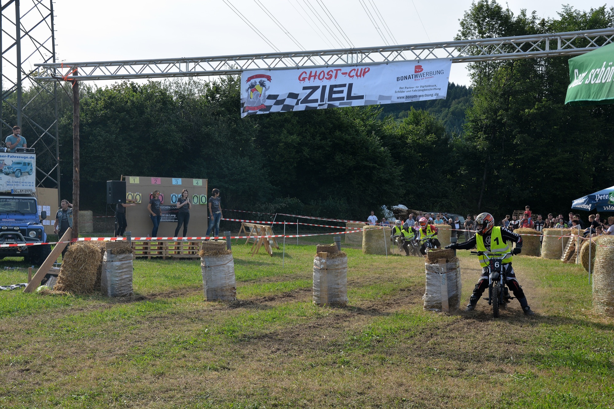 Los gingen die Rennen im bewährten Le-Mans-Start. Nach dem Startschuss mussten die Fahrer eine Distanz von zehn Metern zu ihren laufenden Pocket-Bikes rennen. Diese wurden von den Boxenludern gehalten, damit der Fahrer nur noch aufsteigen musste. In der ersten Kurve kam es dann schon öfter zu kleineren Reibereien, um schnellstmöglich an die Spitze zu gelangen. Auch die letzte Steilkurve sorgte für Spannung. Immer mal wieder kam es zu Stürzen, die zum Glück harmlos waren, oder der Motor des Bikes wurde abgewürgt. Die Fahrer waren jedoch alle durch die vorgeschriebene Schutzkleidung gut geschützt. Die Witterungsverhältnisse der letzten Tage hatten dafür gesorgt, dass dieses Jahr kein Matschloch den Circuit zusätzlich erschwerte. Von Rennen zu Rennen lagen die Fahrer enger beieinander und sorgten so für eine immer spannendere Atmosphäre beim »Ghost-Cup«. Im dritten Rennen konnte der zweite Gewinner nicht eindeutig ermittelt werden, da zwei Teams nahezu gleichzeitig ins Ziel einfuhren. Ein Kamerabeweis lag leider nicht vor, also was tun? Kurzerhand mussten die Teams einen Freiwilligen suchen, um bei einem Radler-Wetttrinken den Sieger zu ermitteln.