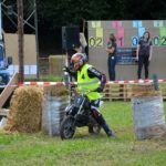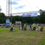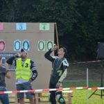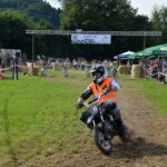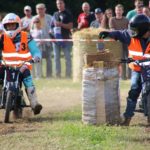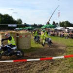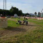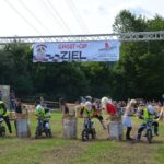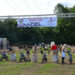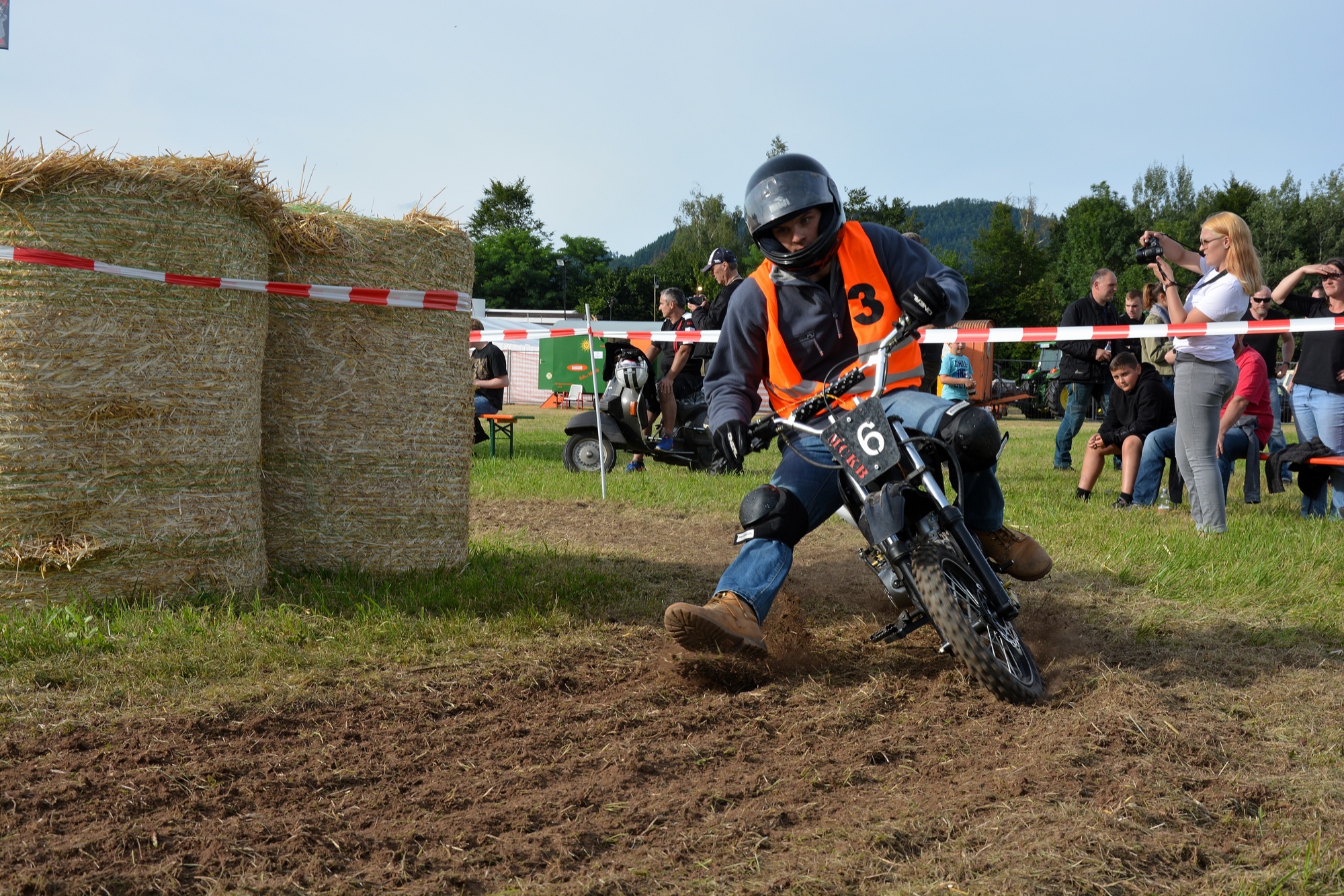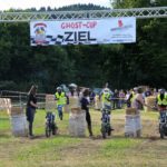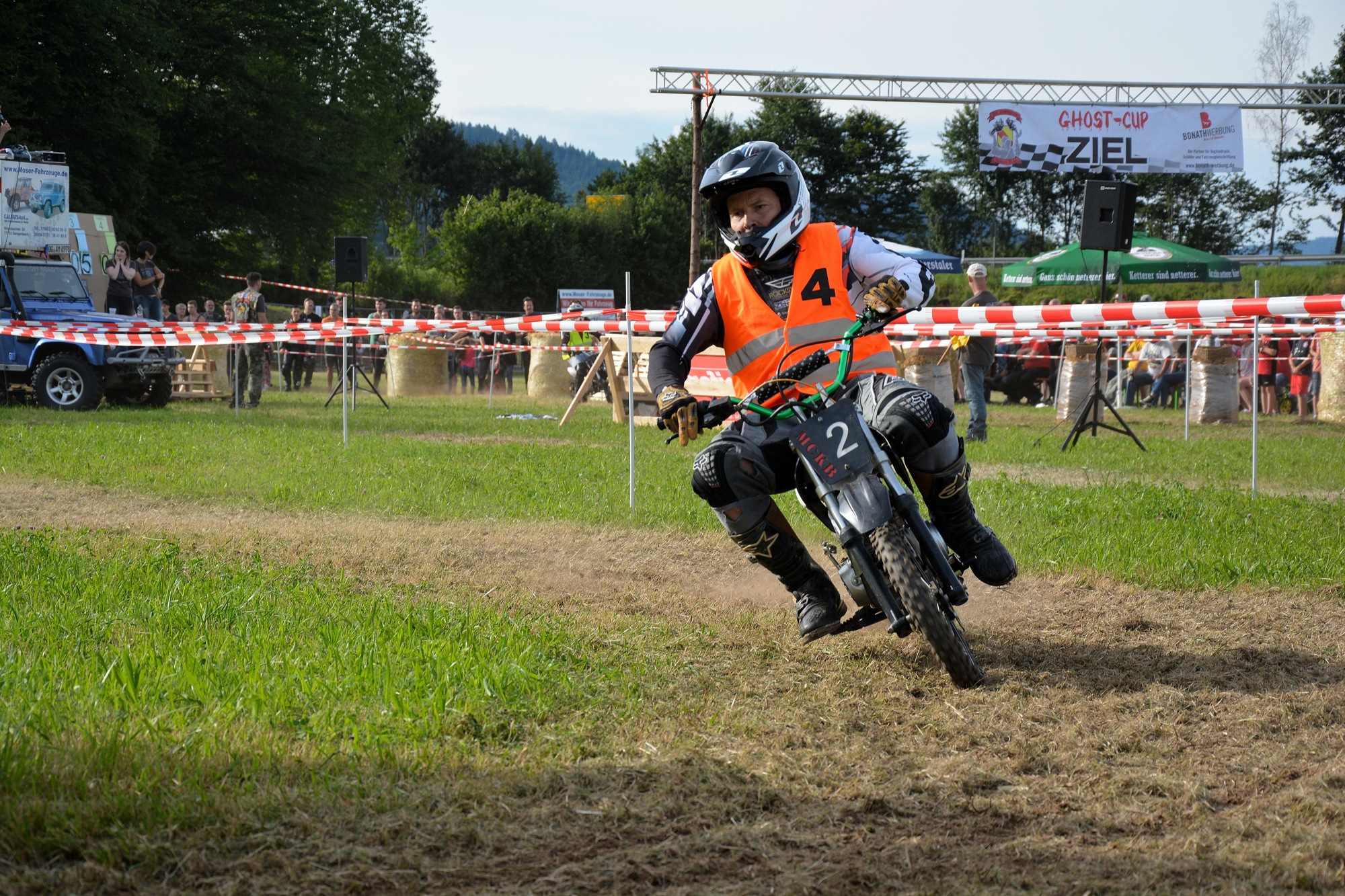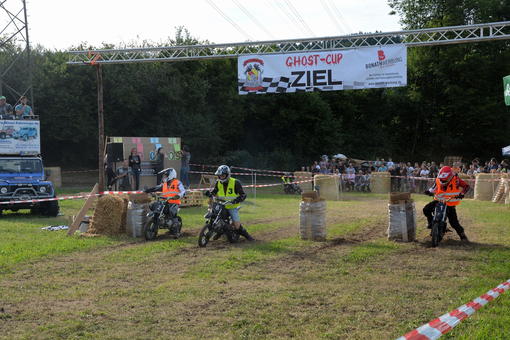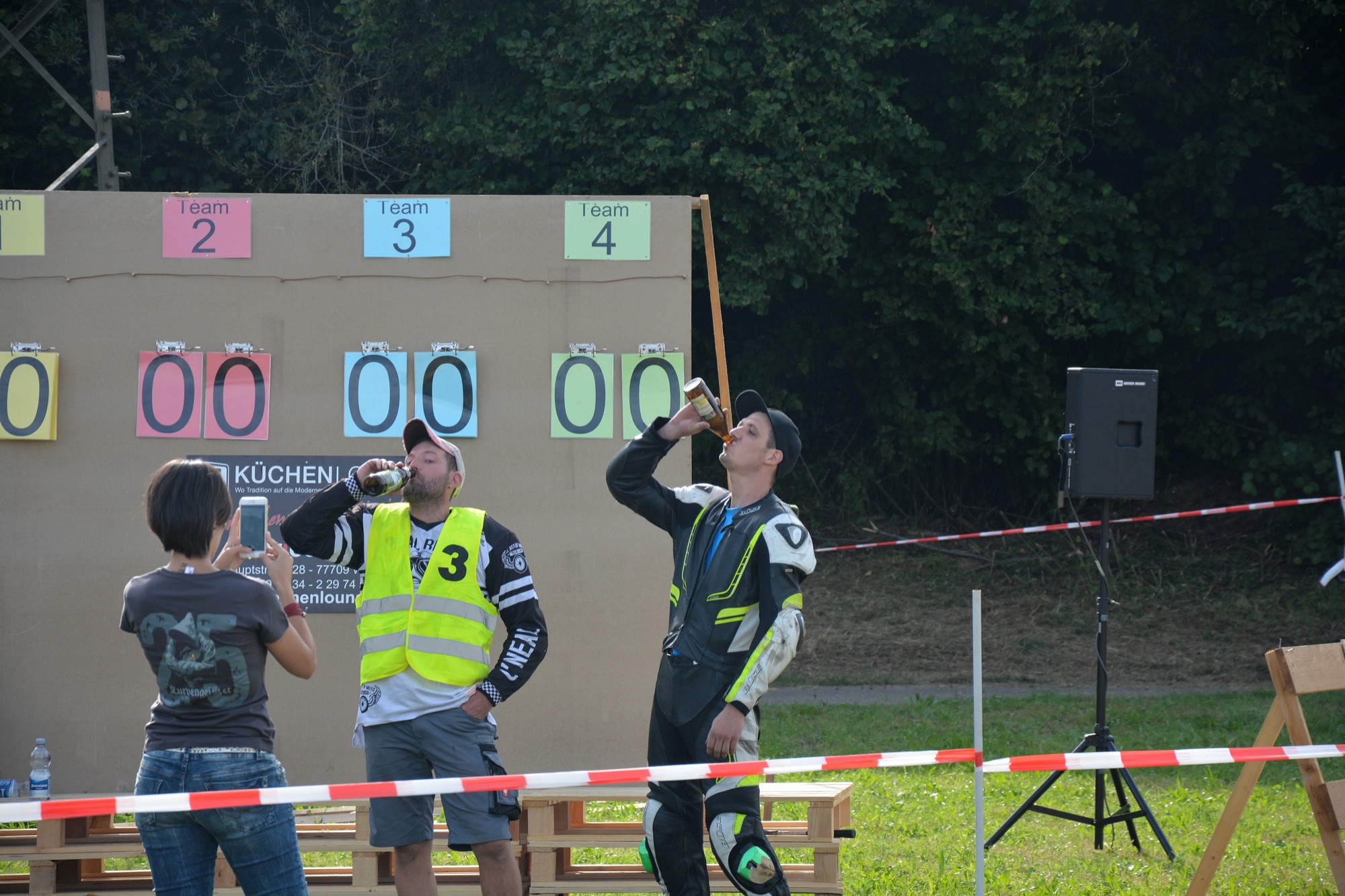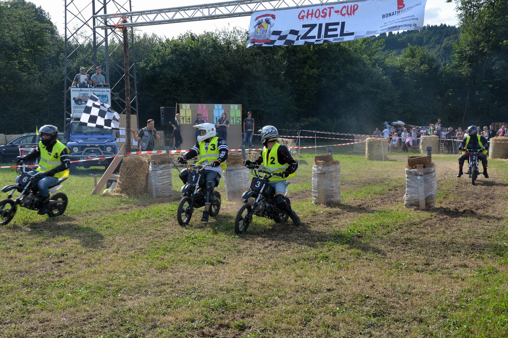 Los gingen die Rennen im bewährten Le-Mans-Start. Nach dem Startschuss mussten die Fahrer eine Distanz von zehn Metern zu ihren laufenden Pocket-Bikes rennen. Diese wurden von den Boxenludern gehalten, damit der Fahrer nur noch aufsteigen musste. In der ersten Kurve kam es dann schon öfter zu kleineren Reibereien, um schnellstmöglich an die Spitze zu gelangen. Auch die letzte Steilkurve sorgte für Spannung. Immer mal wieder kam es zu Stürzen, die zum Glück harmlos waren, oder der Motor des Bikes wurde abgewürgt. Die Fahrer waren jedoch alle durch die vorgeschriebene Schutzkleidung gut geschützt. Die Witterungsverhältnisse der letzten Tage hatten dafür gesorgt, dass dieses Jahr kein Matschloch den Circuit zusätzlich erschwerte. Von Rennen zu Rennen lagen die Fahrer enger beieinander und sorgten so für eine immer spannendere Atmosphäre beim »Ghost-Cup«. Im dritten Rennen konnte der zweite Gewinner nicht eindeutig ermittelt werden, da zwei Teams nahezu gleichzeitig ins Ziel einfuhren. Ein Kamerabeweis lag leider nicht vor, also was tun? Kurzerhand mussten die Teams einen Freiwilligen suchen, um bei einem Radler-Wetttrinken den Sieger zu ermitteln.