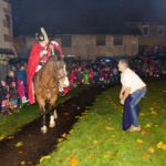 Am alten Kirchturm im Schein des Feuers wurde das Martinsspiel aufgeführt. Blandine Andree las die Martinslegende vor. Franz Willmann übernahm darin die Hauptrolle – und das bereits zum 50. Mal. Als Martin von Tours ritt er auf Wallach Dario am alten Kirchturm entlang. Josef Schmidt spielte den armen Mann, der am Wegrand um Gaben bat. Das Martinsfeuer der Feuerwehr loderte, das Blasorchester spielte und Farnz Willmann trennte als Heilger Martin seinen Umhang und gab ihn dem Armen.