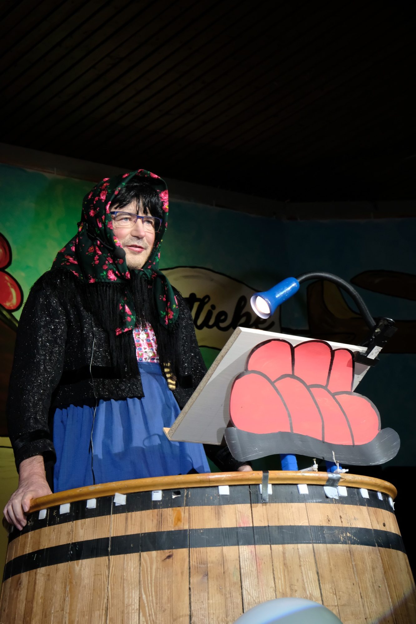 Selbst die klassische Büttenrede hat ihren Platz am Biberball. Peter Baumann kommentiert als »Wiebli vom Hongerer Stei« das Zeitgeschehen und entpuppt sich als fleißiger Leser der Heimatzeitung Schwarzwälder Post.
