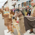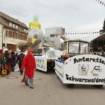 Für ideenreichen Narrenspaß und aufwändige Umzugswagen sorgten auch die acht Biberacher Umzugsgruppen. Eine überdimensionale, silberne 25 drehte sich auf dem Wagen der Schwarzwaldneger und Antarctica. Ebenfalls das 25-jährige Jubiläum feierte die Frauengruppe Camanieras. Die URP hatten sich in Rebhofhexen mit spitzen Zauberhüten und wallenden Gewändern verwandelt. Die Närrische Familie hatte es in den wilden Westen verschlagen, wo sich Indianer und Cowboys ein Stelldichein gaben.