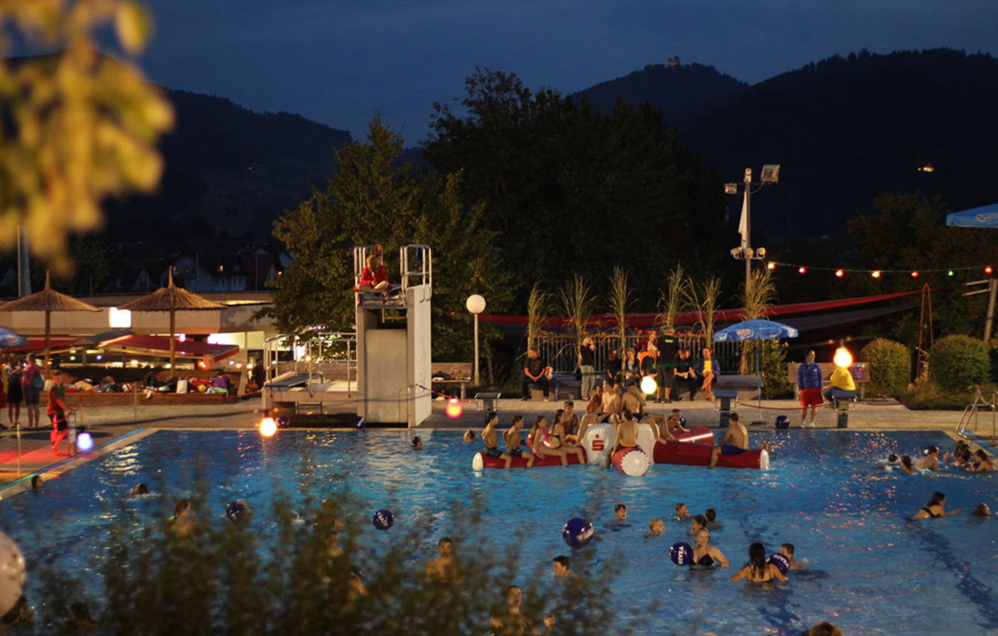 Trotz Regen lockte das alljährliche Flutlichtbaden der DLRG Biberach e. V. am vergangenen Freitag rund 700 Besucher ins stimmungsvoll beleuchtete Waldterrassenbad Biberach.