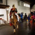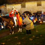 Die Kinder aller drei Kindertageseinrichtungen, St. Blasius, St. Barbara und Fliegerkiste nahmen anschließend selbst ihre schönen Laternen und zogen gemeinsam durch die Straßen. An drei Stationen machten sie Halt. Die erste Station war am alten Kirchturm. Um das Martinsfeuer spielten Reiter Franz Willmann mit Wallach Orion und Josef Schmidt die bekannte Legende nach. Als Martin von Tours teilte Franz Willmann seinen Mantel und gab die abgeschnittene Hälfte Josef Schmidt, der den frierenden Mann gab.