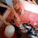 Die Naturkindergarten-Kinder waren am Schlüpftag zu Besuch auf dem Wiedmer-Hof und konnten die Küken deswegen gleich in ihre neue Behausung begleiten, sie mit Wasser und Futter versorgen. Wer mochte durfte die Hühnerbabys mit der Hand füttern. Dafür tunkten die Kinder erst den Finger in Kamillentee, tauchten ihn dann ins Futter und hielten die so präparierten Finger in die Kükenkiste. Für beide Seiten war das ein Gewinn: Die Kinder hatten einen Riesenspaß und die Küken lernten, wie gefressen wird.
