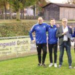 Ein gutes Omen? In dem neuen Trikotsatz des gleichen Sponsors eilt der FVB momentan von Sieg zu Sieg. Zum Fototermin mit den aktiven Spielern waren Karl Ringwald und Juniorchef Lukas Ringwald natürlich eingeladen. Das Übergabebild zeigt von links nach rechts den 2. Vorsitzenden des FVB Holger Schilli, Juniorchef Lukas Ringwald, Karl Ringwald und den 1. Vorsitzenden Volker Heizmann. Der FV Biberach bedankt sich bei seinem langjährigen Unterstützer für dessen Engagement, besonders in dieser schwierigen Zeit. Fotos: Verein