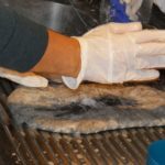 Nach jeweils zwei aufgebrachten Lagen wird der Schuh gewendet, der seitliche Überstand eingeschlagen und durch Reiben ebenfalls verfilzt. Auf diese Weise wird die untere mit der oberen Lage verbunden. »Es ist mir einmal passiert, dass ich das nicht richtig gemacht hab´«, gesteht Gwendolyn Hättig, »da ging der eine Schuh dann auf der Seite auf, nur der andere Schuh war gut.« Weil es nur wenige Einfüßler gebe, habe sie daher nochmals frisch anfangen müssen, schmunzelt sie.