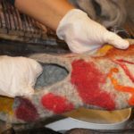 »Ich filze so lange, bis nix mehr kleiner geht«, erklärt die Handwerkelnde, zeitweise außer Atem. Ist der Schuh so weit fertig, wird er in Essigwasser gewaschen, um nach der ausgiebigen Behandlung mit Seifenlauge den PH-Wert wieder dem natürlichen Niveau anzugleichen, darauf folgt das Trocknen.