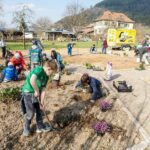 Ausgestattet mit Spaten, Handschuhen und Gießkanne machten sich am Nachmittag die 22 Kinder und ihre Begleitmütter mit viel Vorfreude auf den Weg zum Bienenplatz. Vor Ort wurden sie von Rainer Schätzle, der die Aktion sponsernden Firma Blumen-Göppert aus Haslach und der Gemeindereferentin Anke Haas, empfangen. Die Firma Blumen-Göppert wurde durch Katrin Birk, welche die Aktion plante und fach-fraulich koordinierte, als auch durch den Geschäftsführer Johannes Wöhrle vertreten.