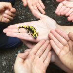 Ein paar der größeren Kinder liefen schon vor und entdeckten einen jungen Feuersalamander – wunderschön und da war die Freude bei den Kindern natürlich sehr groß. Dieser krabbelte auf die Schuhe und auf die Hände der Kinder. Fürsorglich wurde er wieder am Rande des Weges abgesetzt.