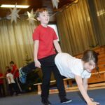 Rasant ging es danach bei den Jungs zu. Neben Turnübungen an der Bank und auf dem Boden waren nun auch ein Sprungbrett, Bock sowie der Kasten die verwendeten Geräte. Somit konnte man hohe und weite Sprünge sehen, was den Jungs viel Spaß machte. Aber auch die menschliche Schubkarre, die natürlich paarweise durchgeführt wird, wurde gezeigt.