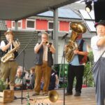 „Das ist nur Wasser“, lachte eine Besucherin, „dafür ist’s ja schön warm.“ Sportlich nahm auch die „Homberle Bläch-Bänd“ aus Steinach die besonderen Umstände. Statt wie geplant über den großen Platz, verlegten die elf Männer ihren Einmarsch kurzerhand auf die Bühne, auf der es sich im Gänsemarsch und zünftig in die Instrumente blasend schön trocken hin- und her marschieren ließ.