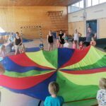 An jeder Station gab es etwas aus dem Weltraum zu entdecken: So bevölkerten Marsmännchen, Sternschnuppen und Raketen vorübergehend die Turnhalle. Zum Abschluss startete die Rakete in Form des großen bunten Fallschirms noch einmal und flog dann weiter.