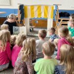 Anschließend durften sich alle Kinder um ein Vorhangtheater versammeln und die Geschichte „Der Regenbogenfisch stiftet Frieden“ nach Marcus Pfister bestaunen. Mit Stabfiguren wurden die Kinder von der Unterwasserwelt in ihren Bann gezogen. Ein großer Wal wird von den kleinen Fischen ausgeschlossen, wehrt sich und schon ist die Situation für alle Beteiligten verfahren. Zum Glück lässt sich das Gegeneinander durch den Mut des Regenbogenfisches dank eines Gesprächs wieder in ein Miteinander verwandeln.