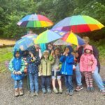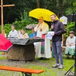 Der Tag begann um 11 Uhr an der Luisenhütte mit einem gut besuchten Gottesdienst. Pfarrer Bonaventura Gerner und der Kinderchor KiKiBi, geleitet von Ilka und Samira Heizmann, sorgten für eine feierliche Atmosphäre. Die Schirme wurden aufgespannt, die Ministranten schlüpften in Regenmäntel. In den Fürbitten baten die Kinder um Schutz, Liebe und Fürsorge für alle. „Du hast uns deine Welt geschenkt“ sangen die KiKiBi-Kinder vom Regengeplätscher unbeeindruckt. Pfarrer Gerner hob hervor, wie wichtig Spiel und Bewegung für Kinder sind – „ein Grundbedürfnis“, und lobte den neuen Spielplatz an der Luisenhütte. Nach dem Gottesdienst segnete er den Platz und die Besucher.