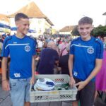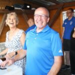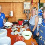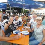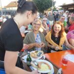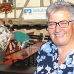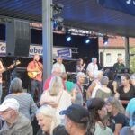 lücklicherweise währte die Himmelsdusche nur kurz und die Sonne strahlte wieder. Rasch trockengewischt – zur Not auch mit Taschentüchern -, füllten sich die Tische und Bänke im Nullkommanix. Und die tagsüber sehr hohen Temperaturen, die pendelten sich nun auf vergleichsweise angenehme Werte ein, zum miteinander „Klönen“ genau richtig. Und natürlich zum Tanzen. Ältere und jüngere Evergreens aus der Sparte Schlager, Rock und Pop luden so sehr dazu ein, dass der eigens freigelassene Platz vor der Bühne nicht ausreichte. Na und? Wozu schließlich gab es den auffordernd breiten Gang vor den Bewirtungsständen?