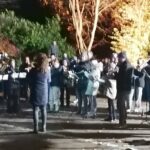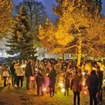 Die Familien an der Kita St. Barbara stimmten sich ebenfalls mit Laternenliedern ein. Dann sahen sie, wie die Legende des St. Martin in Form von großen Fensterbildern zum Leben erweckt wurde. Nach und nach wurden die Fenster enthüllt und in der anbrechenden Dämmerung begannen sie begleitet von der Erzählung der Martinslegende ihre Wirkung zu entfalten. Begleitet und beschützt von Feuerwehr und THW kamen alle drei Gruppen auf dem Schulhof an. Hier versammelten sich dann um die 400 Menschen. Dank des Blasorchesters Biberach erklangen Martinslieder und viele Familien versammelten sich auf den Bänken ringsum und lauschten den wohlbekannten Melodien.