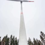 Die Anfahrt zum Windpark gestaltete sich einigermaßen aufwendig. Vom ersten Windrad aus ging es per Shuttle-Bus weiter zur Anlage vier. Dort wurden zunächst anhand eines Image-Films die großen Herausforderungen des Artenschutzes, der Logistik und des Wetters benannt. Im Zuge des Anlagen-Baus wurde ein Auerhuhn-Aktionsplan erstellt, die Zuwegung hergestellt, das Fundament samt Energie-Anlage gebaut und schließlich die Rotorblätter installiert. Entstanden sind vier Anlagen mit jeweils 4,2 Megawatt Nennleistung und der beachtlichen Dimension von 230 Metern Gesamthöhe.