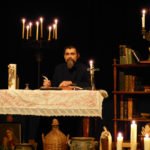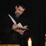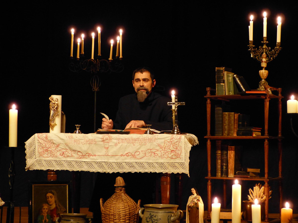 Schließlich betrat der Mönch die Bühne. Oder besser gesagt, er begab sich in eine liebevoll eingerichtete »Abtzelle«, die im Schein unzähliger Kerzen erstrahlte – ein Anblick, der das Publikum erneut spontanen Applaus spenden ließ. In besagter Zelle nahm die Sagengestalt den Gänsekiel zur Hand, um die am häufigste erzählte Version ihrer Geschichte aufzuschreiben, respektive dem Publikum im faszinierend dargebrachten Selbstgespräch zu Gehör zu bringen. Um Grenzstreitigkeiten ging es dabei, und um einen vom 96sten Abt des Gengenbacher Klosters begangenen Betrug, der ihn nach dem Tode keine Ruhe finden lässt.