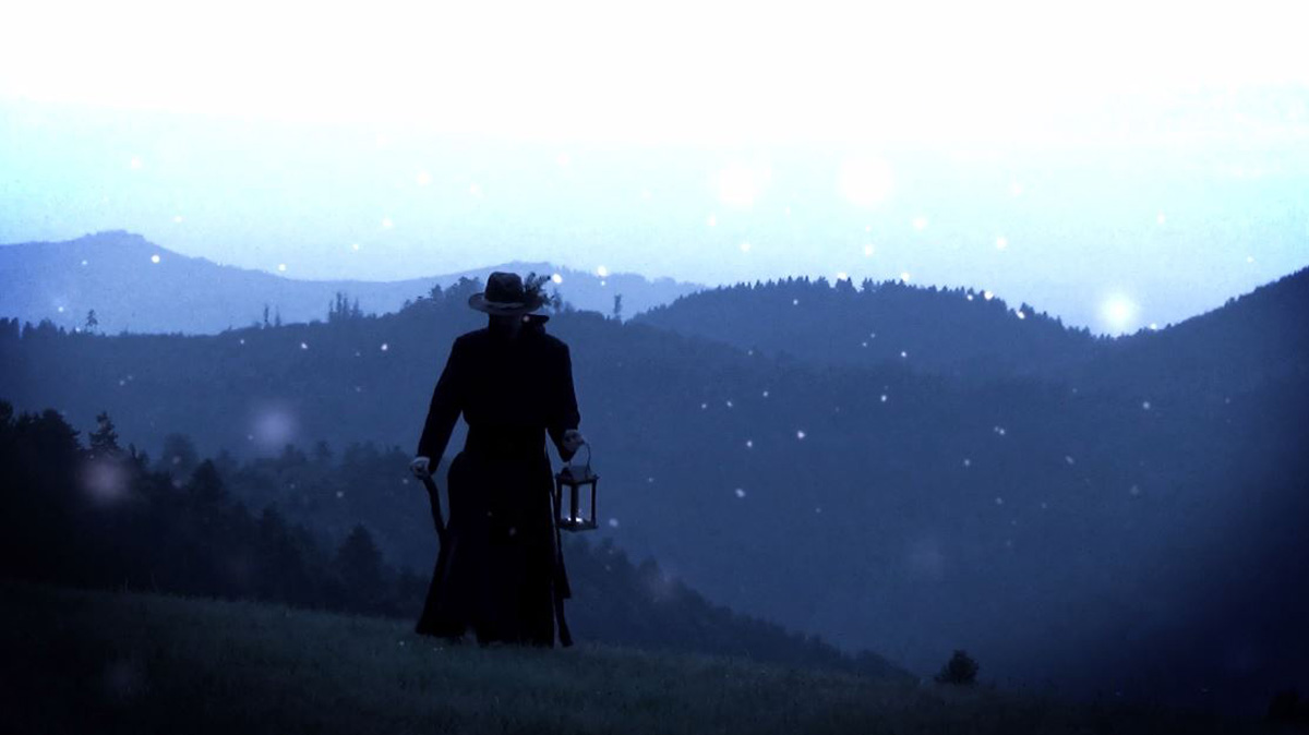 Das Werk zeigt eine schummrig-mystische, winterartige Hügellandschaft. Es ist das Gebiet der Moos, durch deren Wiesen und Wälder sich eine dunkle Gestalt in die Richtung des Zuschauers bewegt. Kleidung, Wanderstab und Laterne weisen sie als einen Mann längst vergangener Zeit aus.