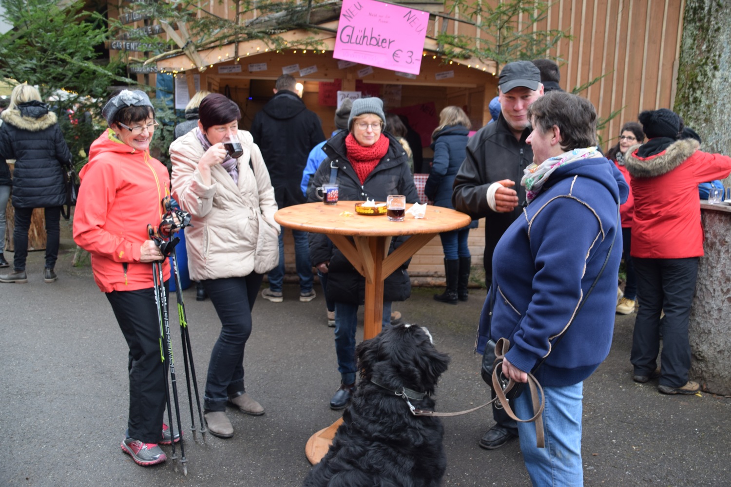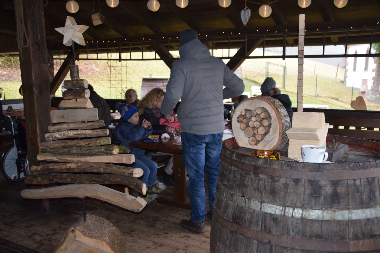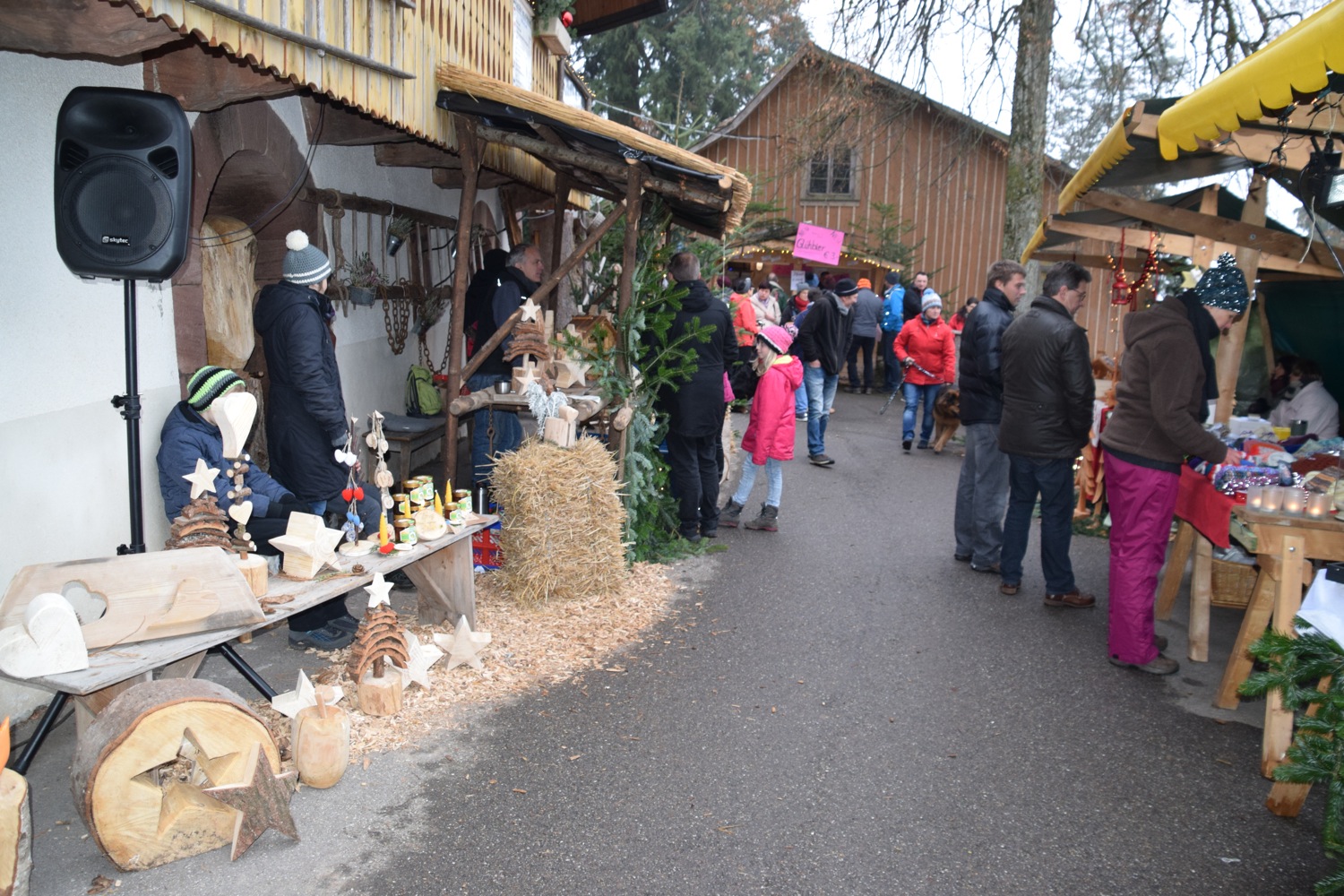 Die erwartungsvollen Besucher empfing ein Hofgebäude, das mit Tannenbäumchen und allerlei Dekorationen aus Baumstämmen weihnachtlich geschmückt war. Die Händler der neun Marktstände kamen aus der näheren Umgebung und boten ein breites Sortiment an schönen, handwerklich hergestellten, weihnachtlichen Dekorationsgegenständen an. Auch liebevoll genähte Kissen, handgestrickte warme Mützen und Schals waren bei der kalten Witterung gefragt. Wer noch keinen Weihnachtsbaum hatte, konnte sich einen schönen auswählen und erwerben.