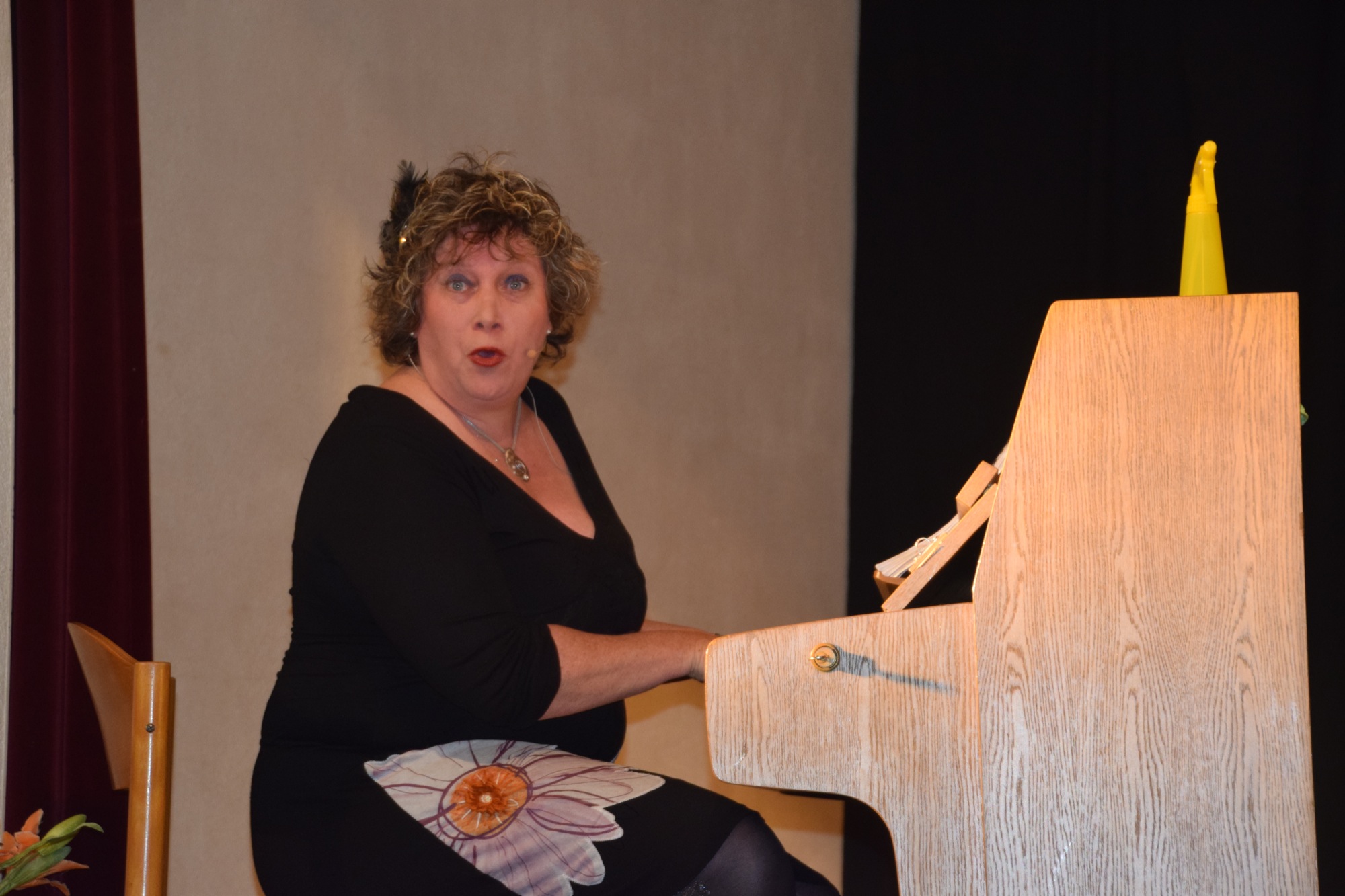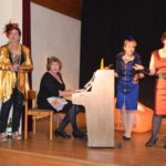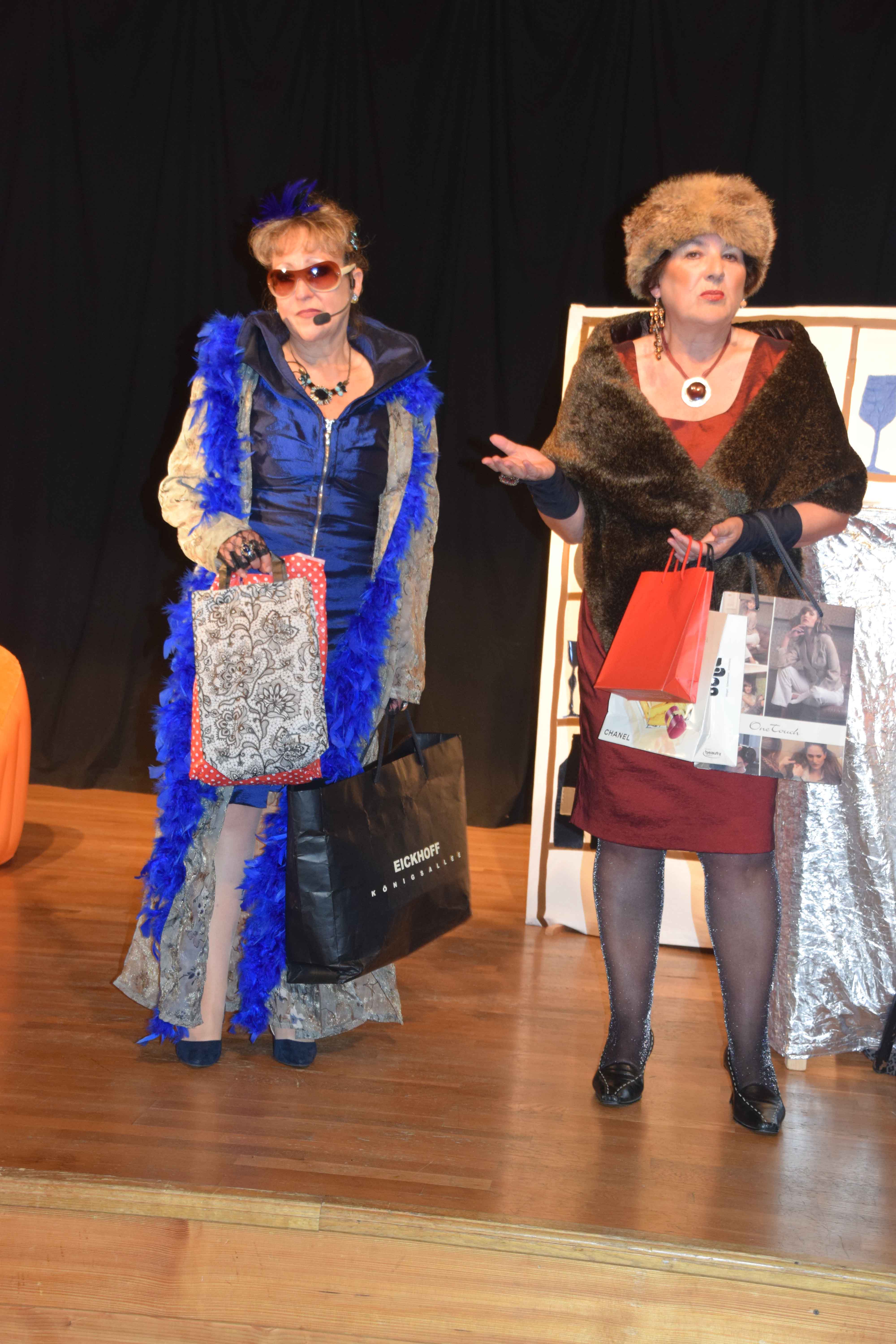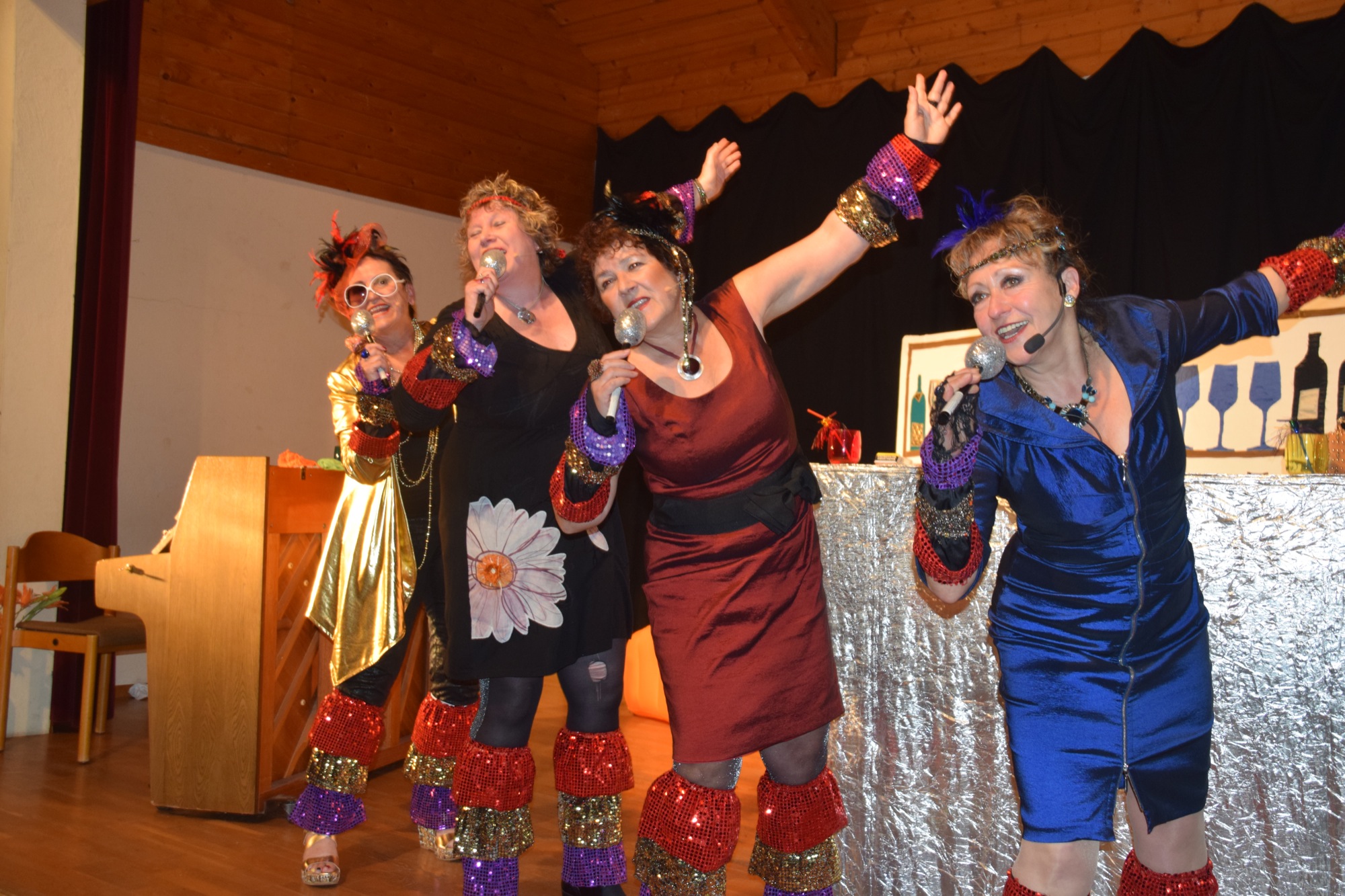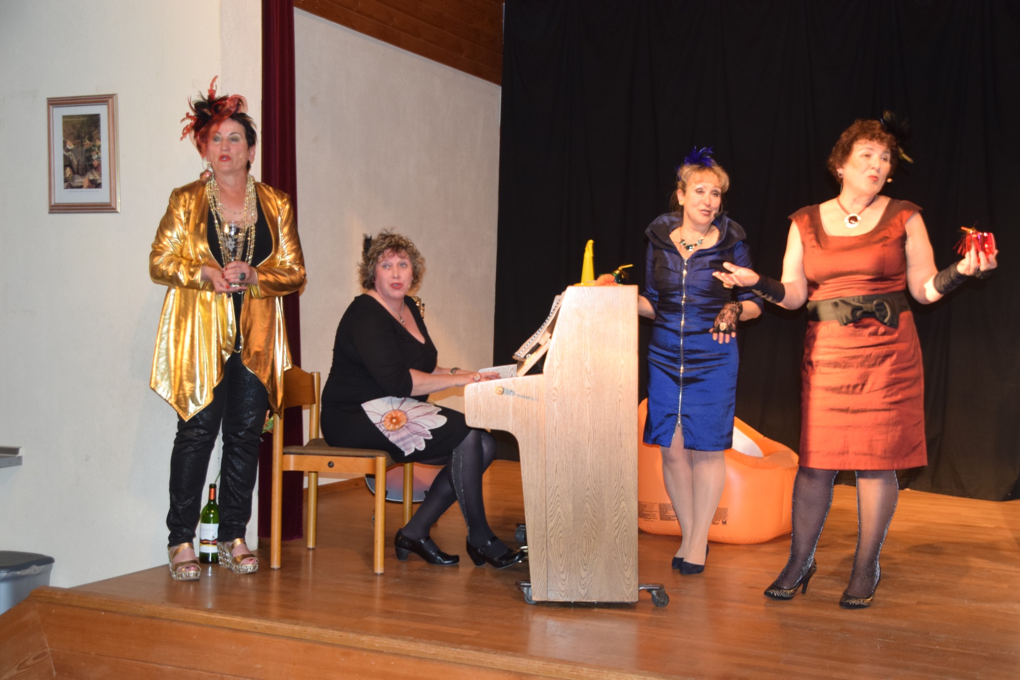 Myriam Endriss brillierte an mehreren Instrumenten. Sie spielte Klavier, griff zu großer und kleiner Gitarre und sang dazu aus voller Kehle. Gabi Elsässer in goldener Robe sang in ihrer kräftigen, schwäbischen Mundart. Köstlich ihr Lied über ihre Messie-Leidenschaft, das sie brillant vortrug. Verena Müller-Möck, gelernte Schauspielerin, flanierte in frivoler Art und Weise als Orchester-Groupie auf der Bühne hin und her. Auch beim Zigaretten-Tango (Melodie: Kriminal-Tango) zeigte sie ihr großes Talent. Einfühlsam beschrieb sie die Zigarette wie einen Liebhaber, die für sie alles bedeutete und der sie alles zu geben bereit war.