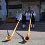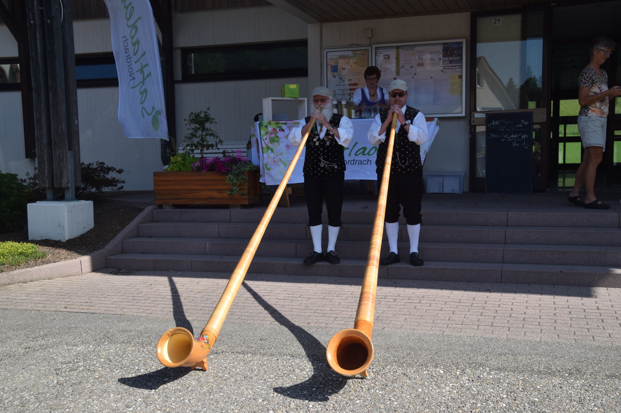 Um zehn Uhr eröffneten Rolf Basler und Paul Boschert vor der Hansjakob-Halle mit ihren Alphörnern musikalisch den »Brennhislitag«. Die beiden Musiker waren den ganzen Tag über auf dem Obstbrennerweg unterwegs und erfreuten die Wanderer an allen Brennhisli-Stationen.