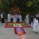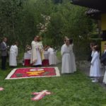 Bereits am Samstag haben fleißige Hände die Blumenteppiche an den drei Altären vor dem Muserhof, Sägewerk Körnle und Riesenbauernhof angelegt. Bei der Pfarrkirche waren es die Kommunionkinder, die zusammen mit ihren Eltern einen langen prachtvollen Blumenteppich vom hinteren Ausgang der Kirche entlang der Kirche bis zur Sakristei anlegten. Wegen des späten Termins war es in diesem Jahr nicht einfach, genügend Blüten zu sammeln.