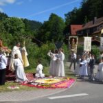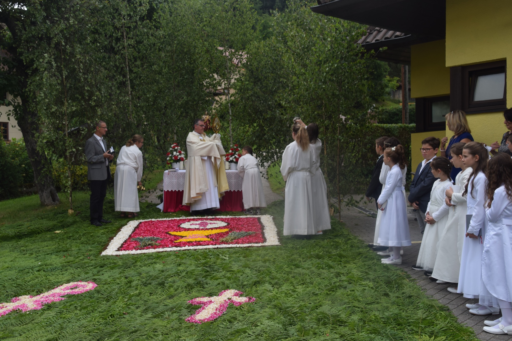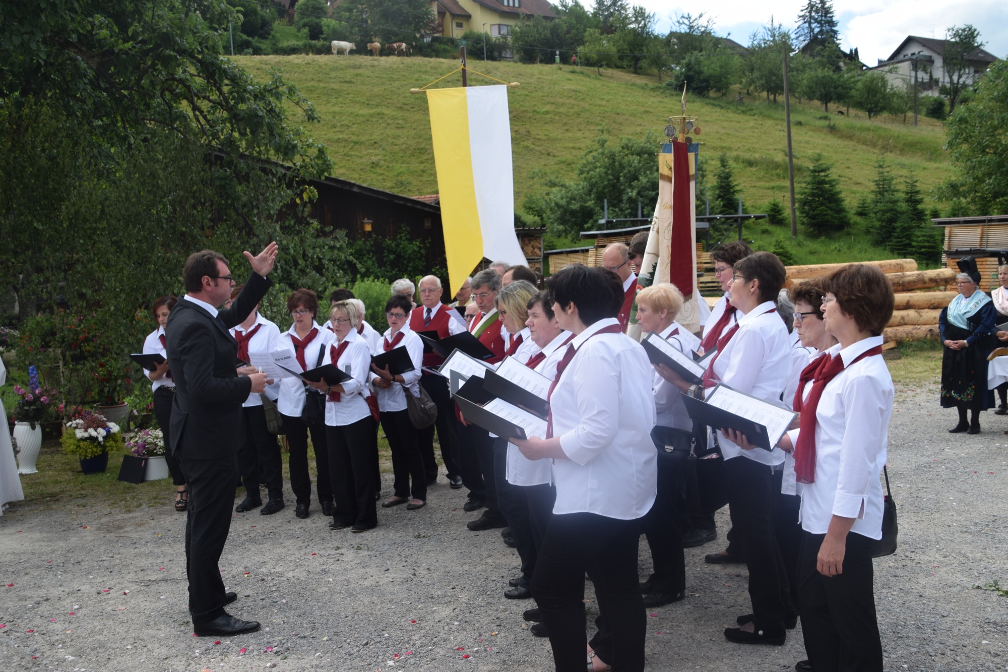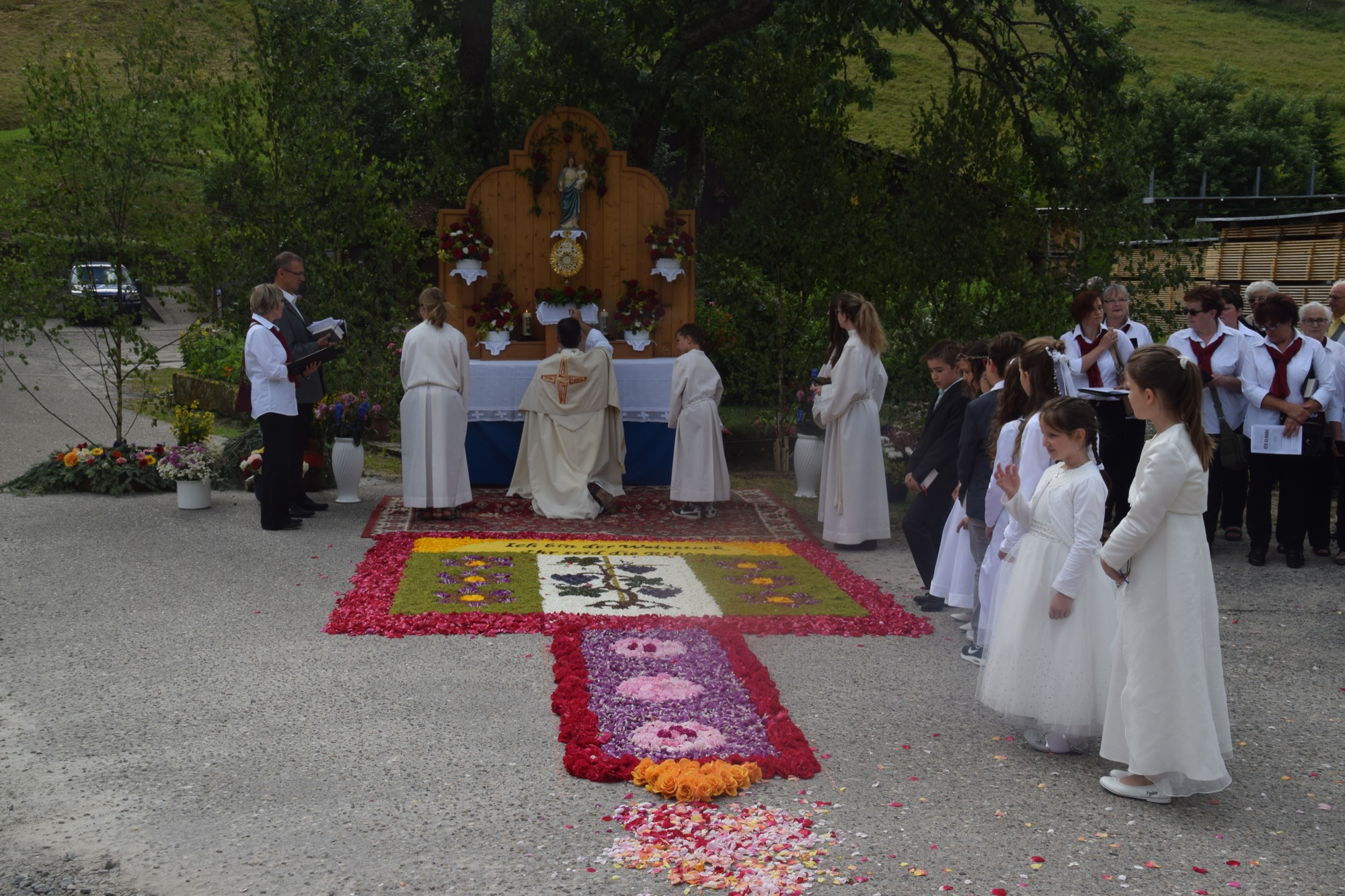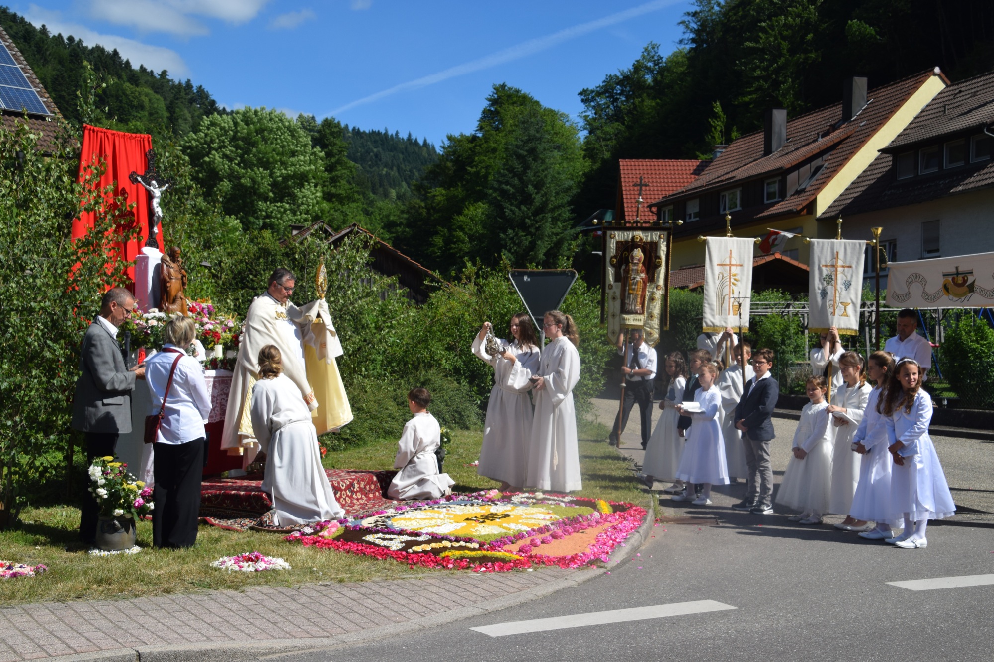 An den drei Stationen waren mit Blumen reich geschmückte Altäre aufgebaut. Davor hatten viele fleißige Hände mit großem Geschick kunstvolle Blumenteppiche mit Glaubens- und biblischen Motiven, zum Tag passend, ausgelegt. Die Familien vom Muser- und Riesenbauernhof sowie vom Sägewerk Körnle und ihre zahlreichen Helfer verdienen für diese jahrzehntelange Tradition ein großes Lob. Nach den Fürbitten an den einzelnen Stationen erteilte Pfarrer Gerner den Segen mit der Monstranz. Der »Chor der Klänge« und die Trachtenkapelle umrahmten die Prozession musikalisch.