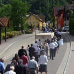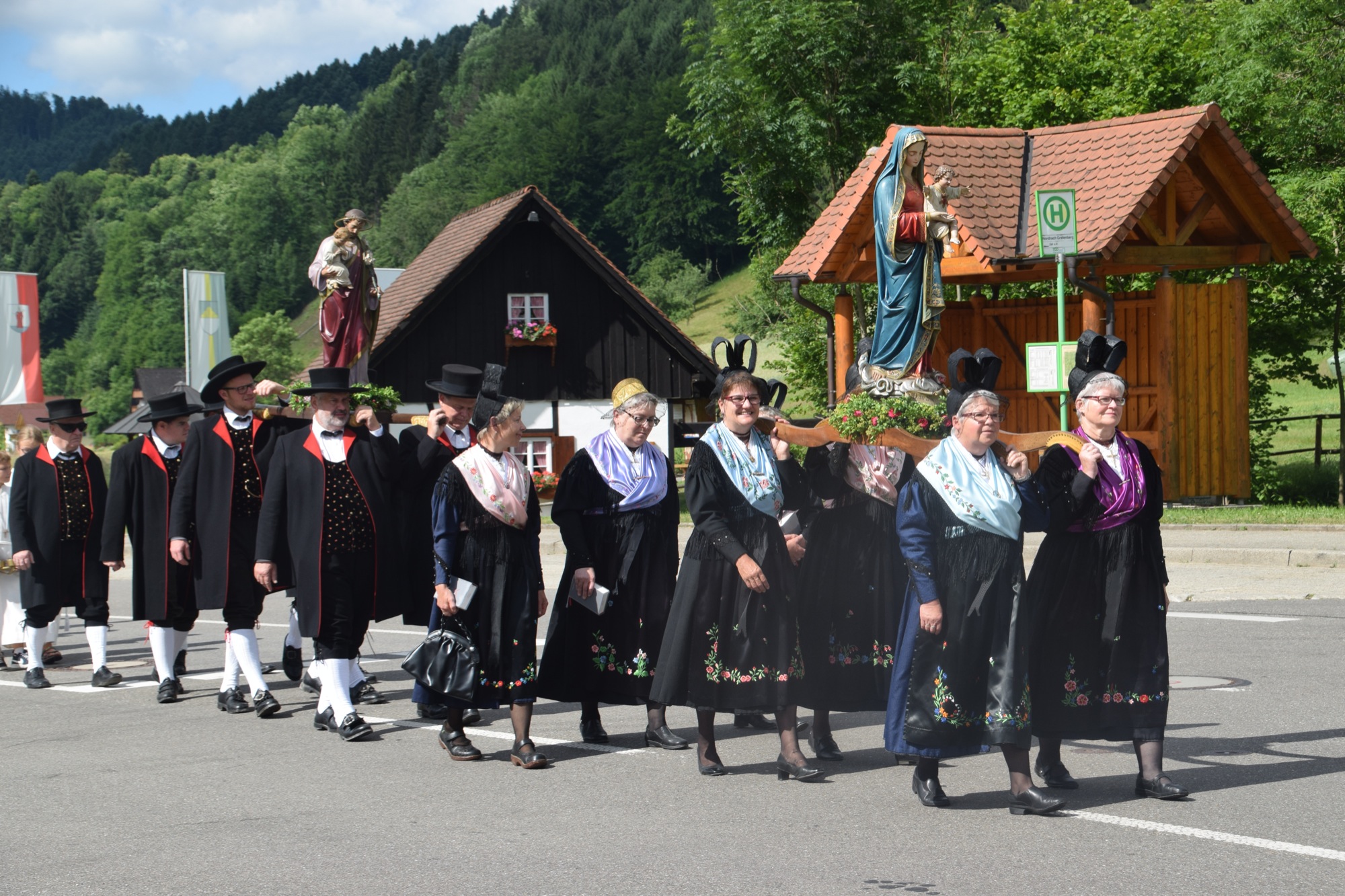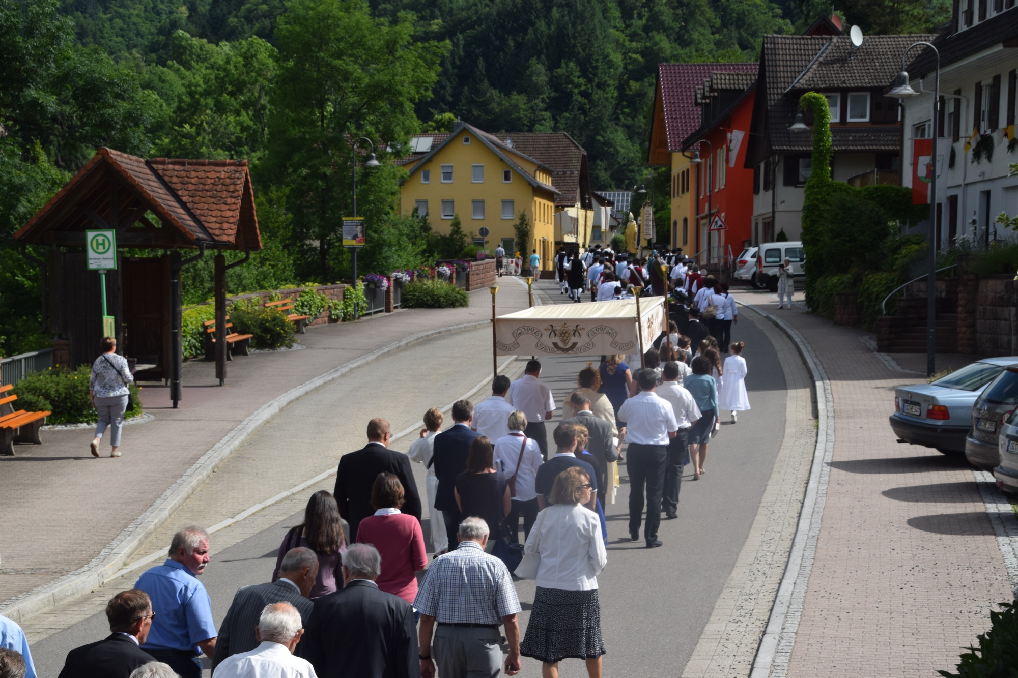 An den Gottesdienst schloss sich die Prozession durch das Dorf an. In diesem Jahr führte der Weg zunächst talabwärts mit den Stationen vor dem Muserhof und dem Sägewerk Körnle. Von dort aus ging es zurück bis zum Riesenbauernhof. An allen drei Stationen waren blumengeschmückte Altäre hergerichtet worden. Ministranten und Erwin Himmelsbach mit der Ulrichsfahne führten die Prozession an. Es folgten die Trachtenkapelle Nordrach unter der Leitung von Roland Weygold, die Feuerwehr mit der Statue des Kirchenpatrons Hl. Ulrich und der »Chor der Klänge« unter der Leitung von Victor Kraus. Frauen und Männer der Trachtengruppe trugen die Statuen von Maria und Josef. Es folgten die Erstkommunionkinder mit ihren Eltern. Den »Himmel« trugen Dieter Herrmann, Gerold Herrmann, Reinhard Herrmann und Jürgen Hug. Die Monstranz unter dem »Himmel« wurde von Pfarrer Bonaventura Gerner getragen. Hinter dem festlichen Zug folgten die anderen Gläubigen.