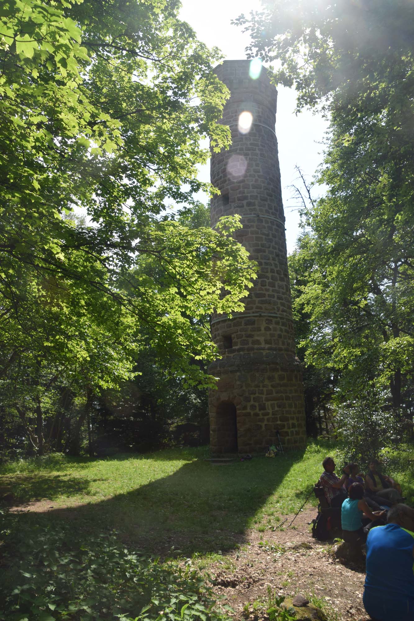 Nach der Stärkung nahm die Gruppe den Aufstieg zum Heidenkopf in Angriff. Ihre Mühen wurden mehr als belohnt. Auf seiner Spitze steht der »Mündelturm«, im Jahr 1909 errichtet im Stil des Moosturms. Von oben hatten die Wanderer eine prächtige Aussicht auf die benachbarten Berge und Täler.