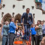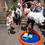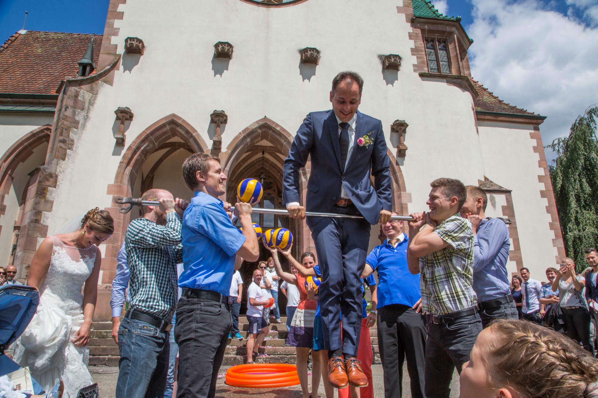 Nach der Trauung gab es einen sportlichen Empfang für das Brautpaar. Für eine Überraschung sorgte das DLRG-Nordrach mit ihrem wassergefüllten Planschbecken. Die Braut bekam Schwimmflügel, der Bräutigam musste sich Taucherbrille, Schnorchel und Schwimmflossen anlegen und die Braut trockenen Fußes sicher über das Wasser tragen. Die Volleyballer vom TV Zell standen mit ihren Trikots und Volleybällen Spalier. Des Weiteren sorgte der Turnerverein mit einer Reckstange, an der Ingbert sein Können unter Beweis stellen musste, für Aufsehen.