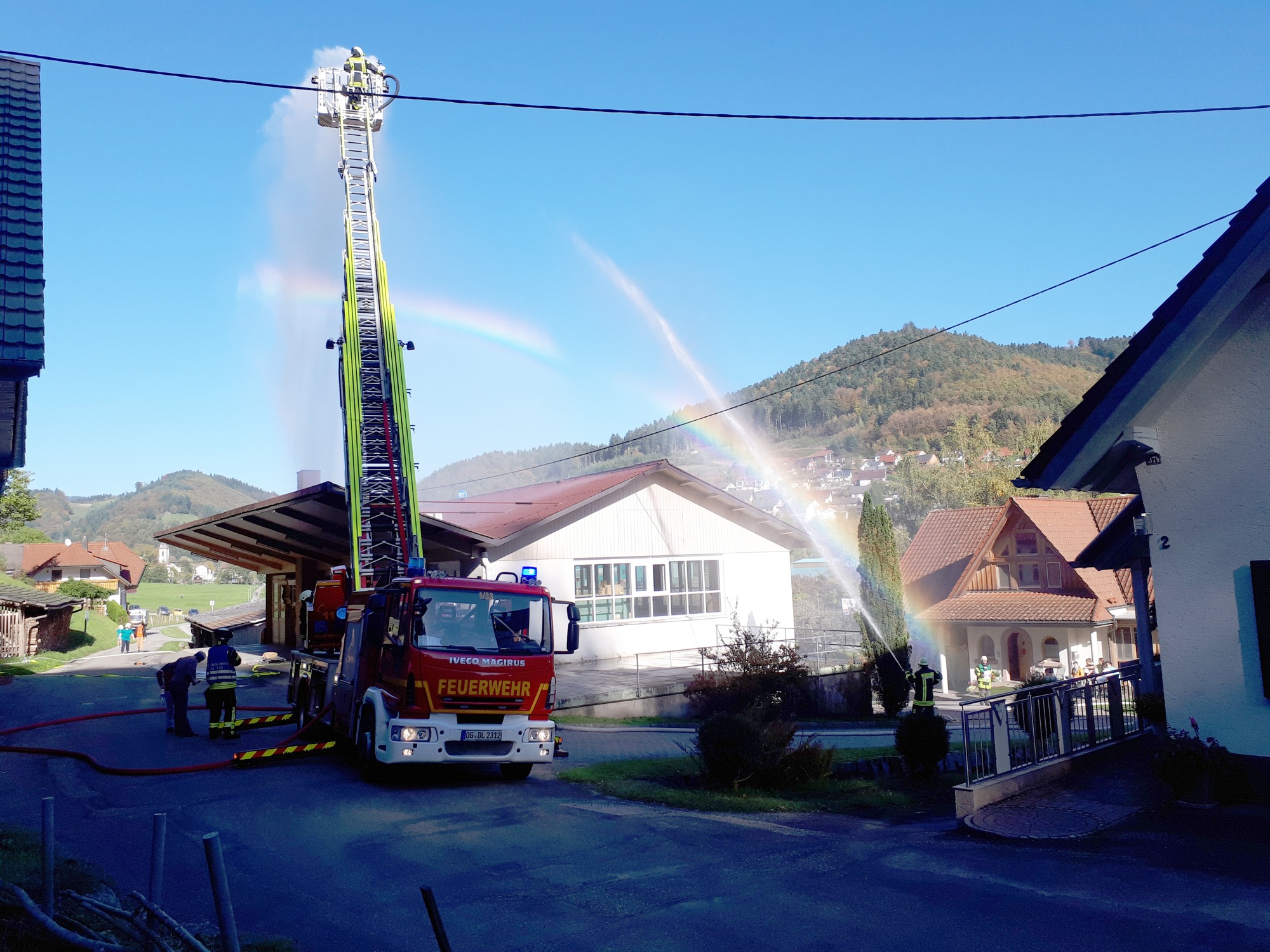 Gerne stellte die Firma Fehrenbacher ihr Objekt zur Übung zur Verfügung und auch die Familie Bächle war sofort bereit, kurzfristig dem DRK ihre Garage zu überlassen. Beiden galt daher der Dank von Kommandant Spinner. Natürlich vergaß er auch nicht die Kameraden der Zeller Wehr, die immer wieder gerne nach Nordrach kommen. In der Zeit der Hauptübungen im Frühjahr und Herbst müssen sie alle umliegenden Gemeindefeuerwehren unterstützen und so hatte man natürlich Verständnis, dass dieses Mal »nur« die Drehleiter zur Übung kam.