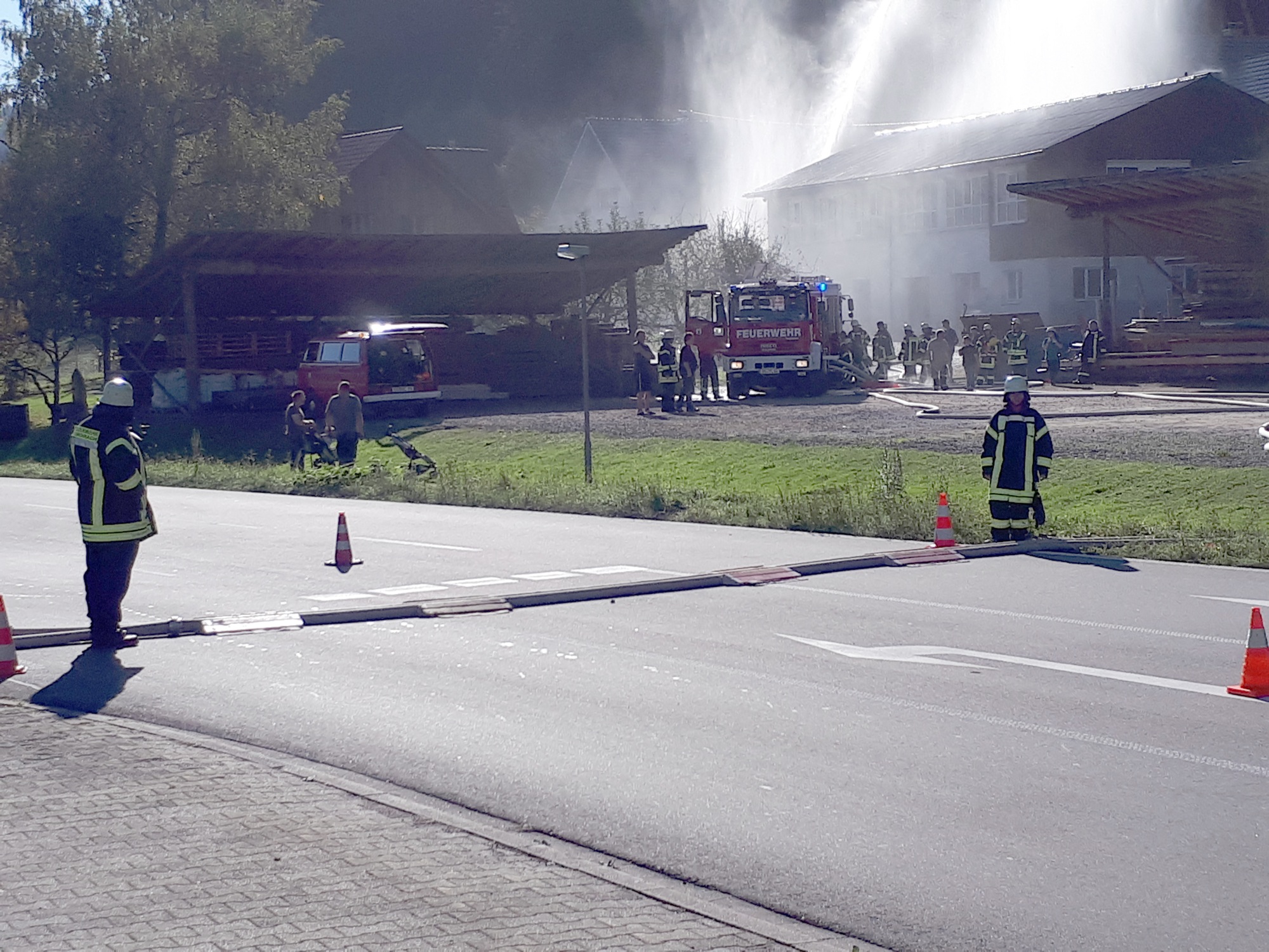 Brände in holzverarbeitenden Betrieben bergen für die Feuerwehr meist besondere Gefahren. So wählte man aus gutem Grund mit der Firma Holzbau Fehrenbacher im Michelbach genau ein solches Objekt für die Herbstübung der Nordracher Feuerwehr, zusammen mit dem DRK Ortsverein.