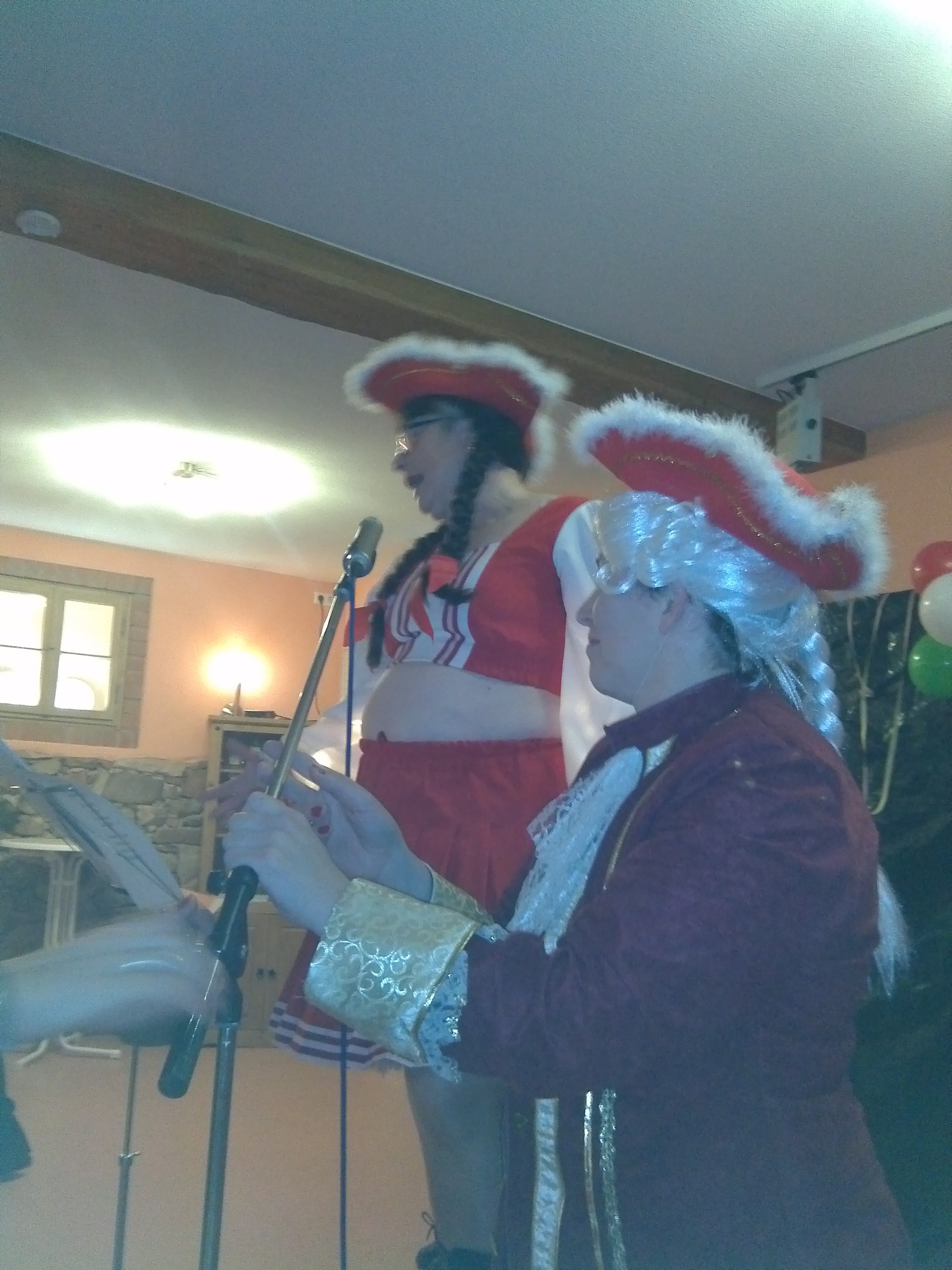 Gleich zu Anfang ging es fetzig los. Funkenmariechen kamen herein, schön anzusehen und mit flottem Schritt. Besonders ein Mariechen (Agnes Walter) stach hervor. Mit Kostüm von Karl Lagerfeld, Stiefeln aus Paris und toller Figur! Besonders der Breittanzschritt hatte es ihr angetan, alle sollten mitmachen. Doch es wurde ihr gleich zu anstrengend. Voller Frust erzählte sie, dass sie schon fünf Männer bei den Hebefiguren verbraucht hat.