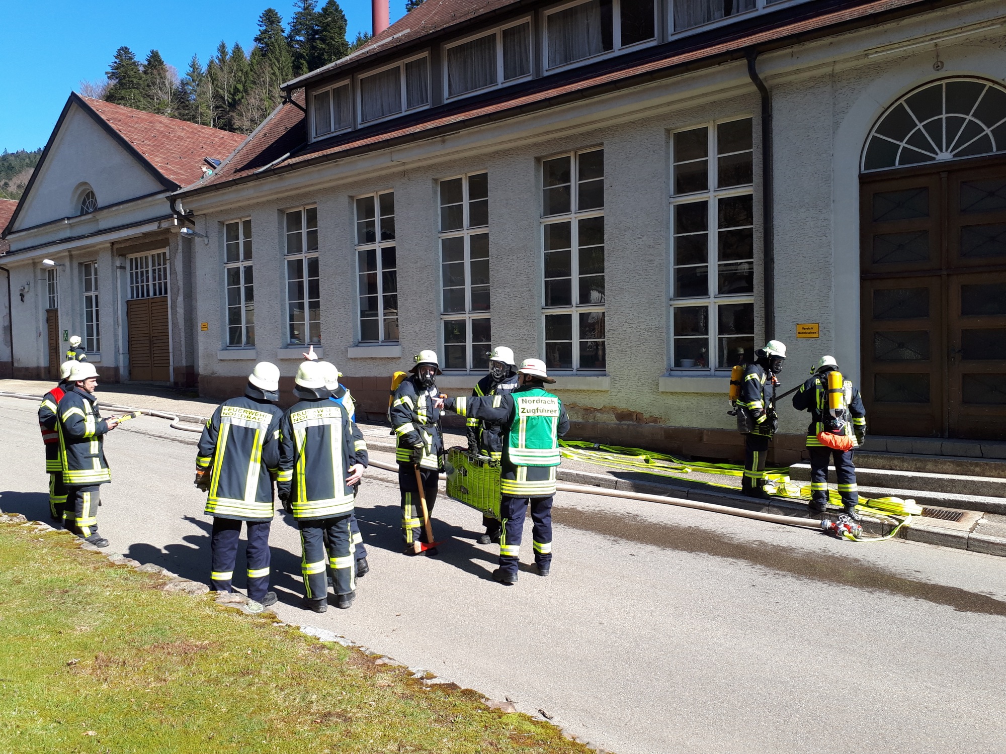 Beim Eintreffen an der »Einsatzstelle« erwartete der Patient, perfekt dargestellt von Organisator Thomas Decker, die Feuerwehr und berichtete dass er keine Ahnung hätte, wie viele Personen sich im Gebäude befinden und er auch sonst nicht weiterhelfen könne. Eine Person machte sich an einem Fenster im Dachgeschoss bemerkbar, eine weitere rief an einem Geländer eines kleinen Balkons um Hilfe. Die Mannschaft des Nordracher Löschfahrzeuges LF10 bekam den Auftrag unter Atemschutz zur Menschenrettung durch das Treppenhaus vorzugehen. Zur Rettung der Person auf dem Balkon wurde die Steckleiter eingesetzt, wobei die Besatzung des mittlerweile eingetroffenen Tanklöschfahrzeuges TLF 16/24 unterstützte. Problematischer stellte sich die Rettung des zweiten Mannes am Dachgaubenfenster dar. Hierzu musste die Drehleiter aus Zell zum Einsatz kommen. Diese wurde umgehend vom Bereitstellungsraum beim Sägewerk Schnurr abgerufen und vor dem Gebäude positioniert. Die Talstraße, welche unmittelbar am Objekt vorbeiführt, war zwischenzeitlich komplett für den Verkehr gesperrt worden. Der erste Angriffstrupp hatte bereits den schwer brandverletzten Arbeiter gefunden und zur Erstversorgung an das DRK übergeben, welches sich im gegenüberliegenden Gebäude einen Verbandsplatz eingerichtet hatte. Mittlerweile befanden sich alle Nordracher Atemschutzträger im Einsatz, daher wurde das Löschfahrzeug LF 16/12 der Zeller Wehr mit weiterem Personal zur Einsatzstelle abgerufen.