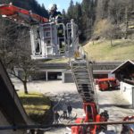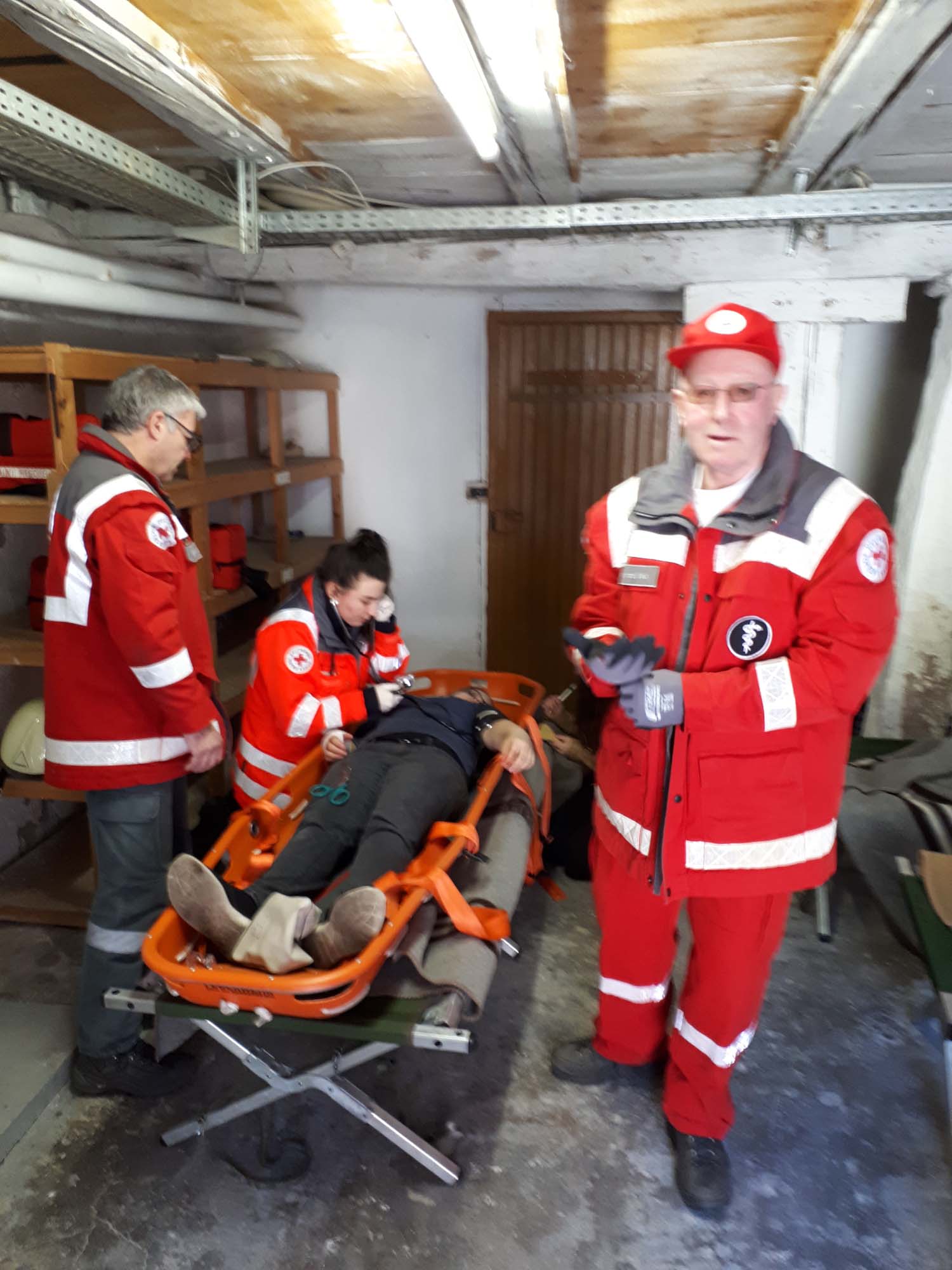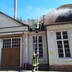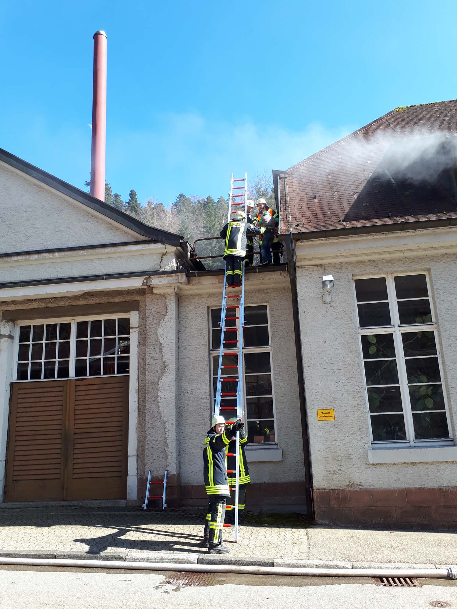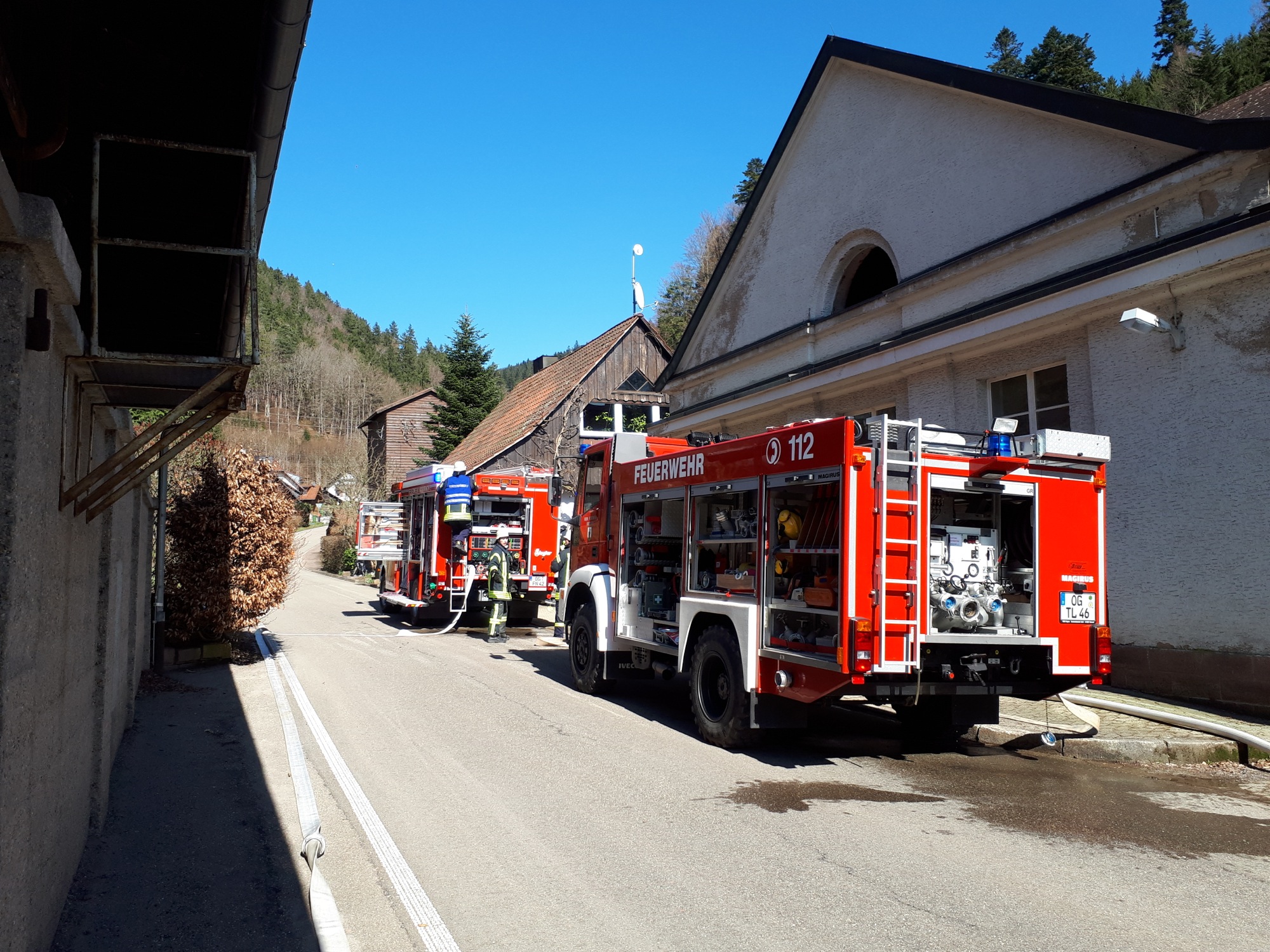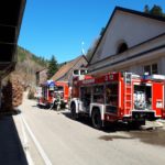 Zwischenzeitlich war eher zufällig der zweite Arbeiter im Kellerlagerraum gefunden worden. Ein Atemschutztrupp hatte sich zur Kontrolle in den Keller begeben und fand die bewusstlose Person, dargestellt von einer erst kürzlich beschafften und 90 kg schweren Rettungspuppe. Entsprechend schwierig gestaltete sich diese Aktion, zu der ein weiterer Trupp mit einem Rettungsbrett angefordert wurde. Letztendlich waren vier Mann erforderlich, um den Arbeiter über die enge Treppe nach draußen zu befördern und dem DRK zu übergeben. Die Wasserversorgung an diesem Objekt ist mehr als hervorragend und schnell herzustellen. Die beiden Löschfahrzeuge aus Nordrach und Zell vorsorgte ein gegenüber dem Objekt befindlicher Überflurhydrant. Zusätzlich stand ebenfalls das neben dem Gebäude befindliche ehemalige Schwimmbad zur Verfügung, welches nun als Löschwasserbecken mit 75 Kubikmeter Wasservorrat dient. Sollte dies immer noch nicht reichen, könnte man auch auf den am Objekt vorbeifließenden Talbach zurückgreifen.