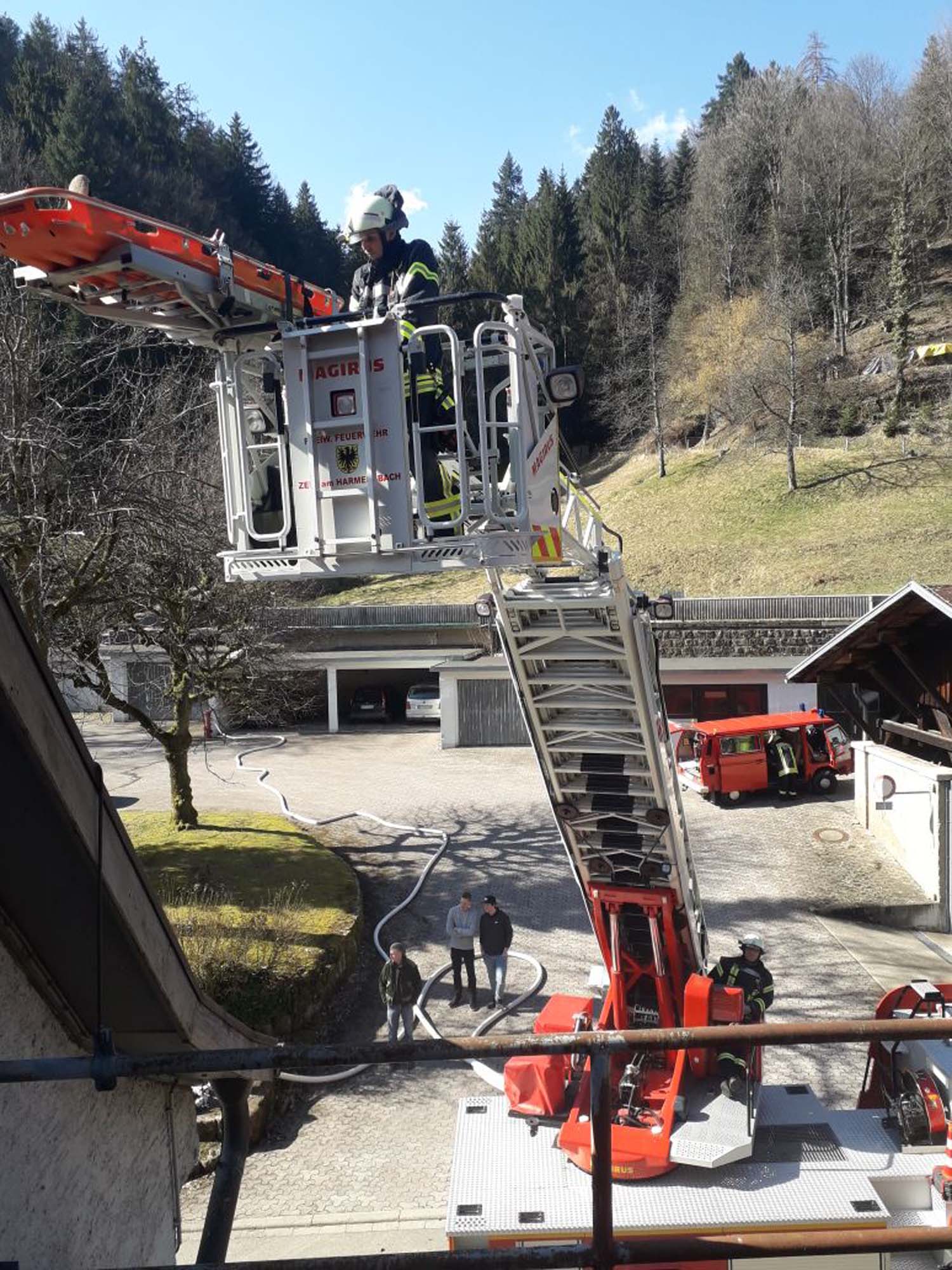 Unter der Einsatzleitung von Kommandant Heiko Spinner rückte zunächst die Nordracher Wehr mit allen Fahrzeugen aus. Schon auf der Anfahrt alarmierte er im Rahmen der Überlandhilfe die Stützpunktfeuerwehr Zell mit Drehleiter und einem Löschfahrzeug zur Unterstützung. Da mehrere verletzte Personen zu erwarten waren, verständigte er anschließend auch die DRK Ortsgruppe Nordrach.